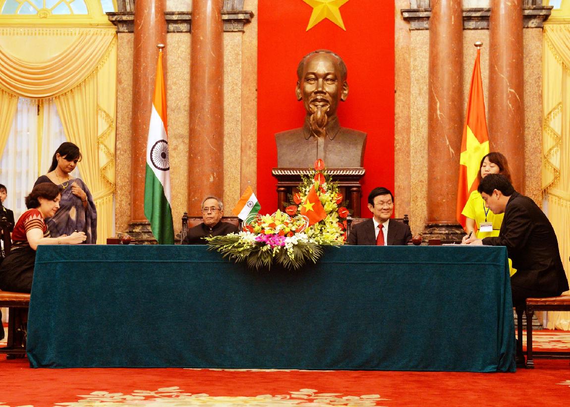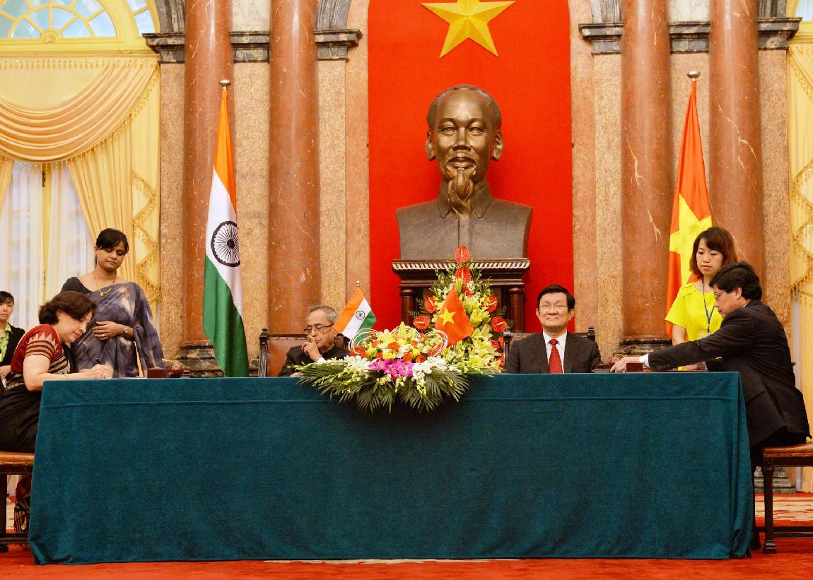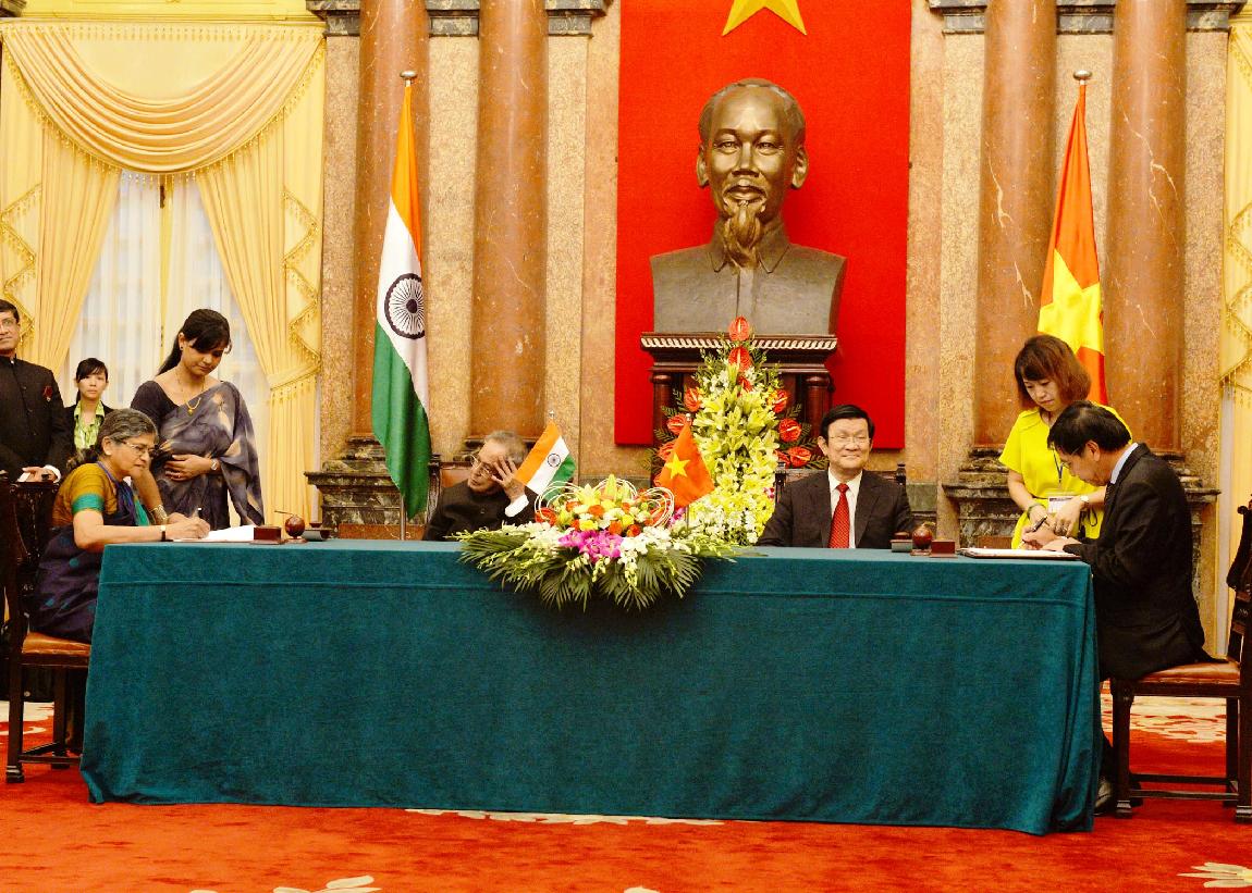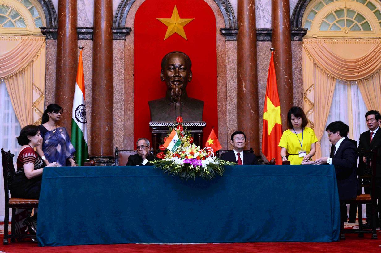 | Caption: | The President of India, Shri Pranab Mukherjee doing the Signing of Agreements during his visit to the Socialist Republic of Vietnam at Presidential Palace at Hanoi in Vietnam on Sep 15, 2014 |