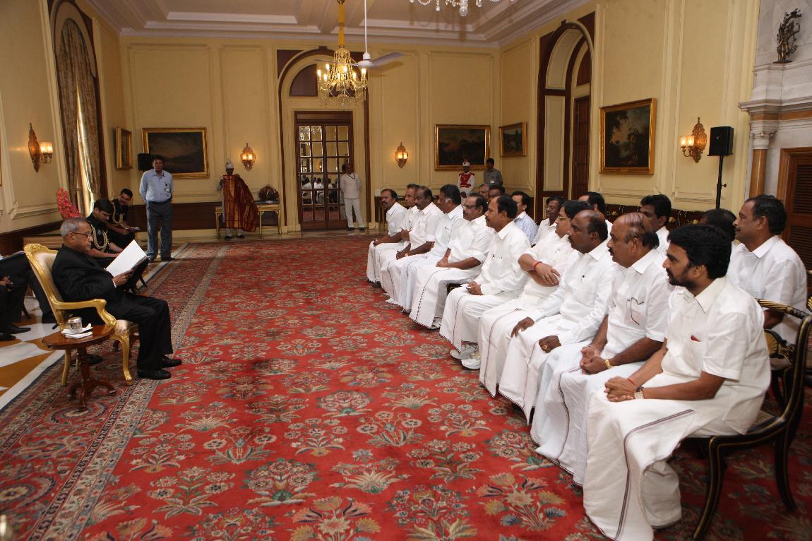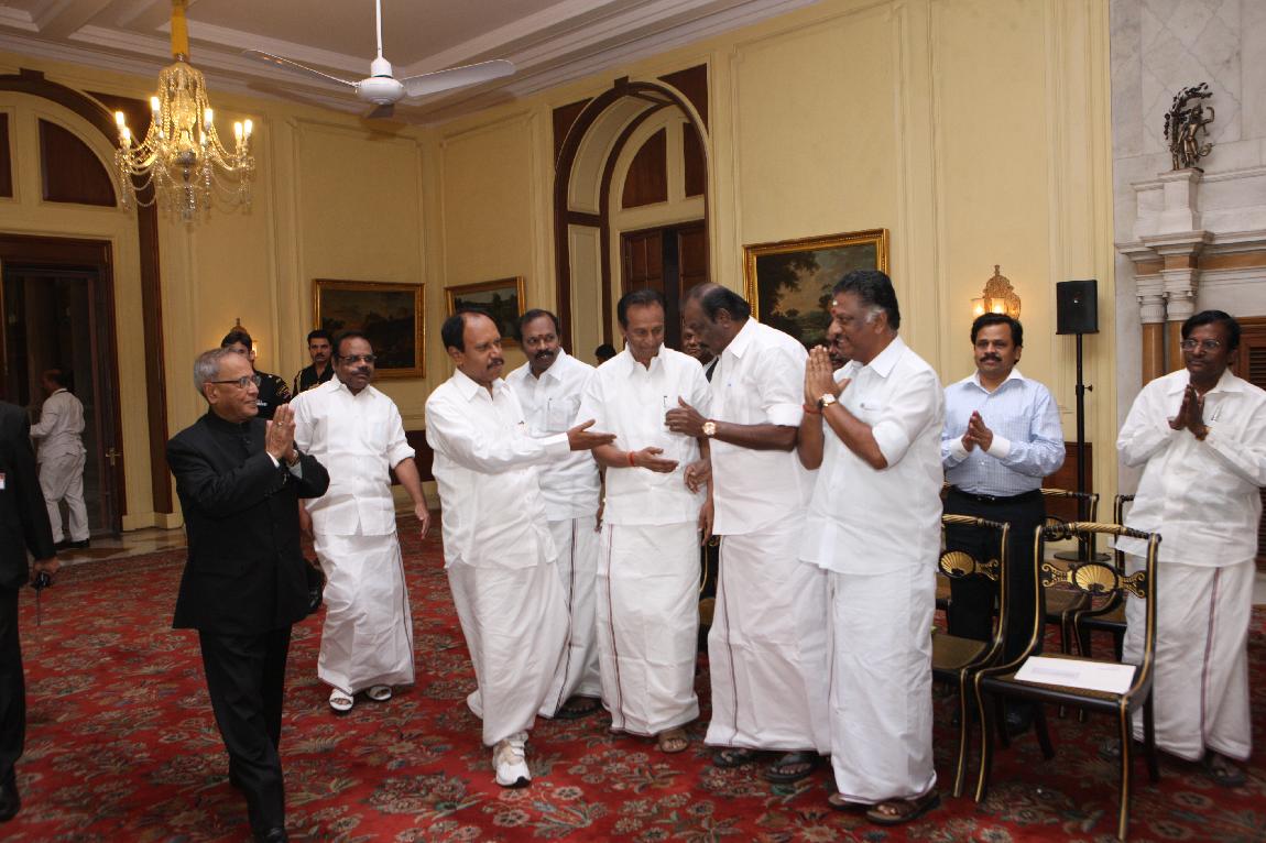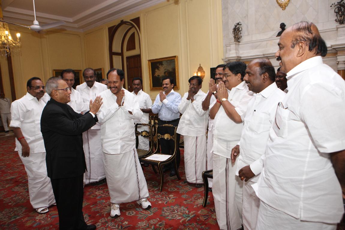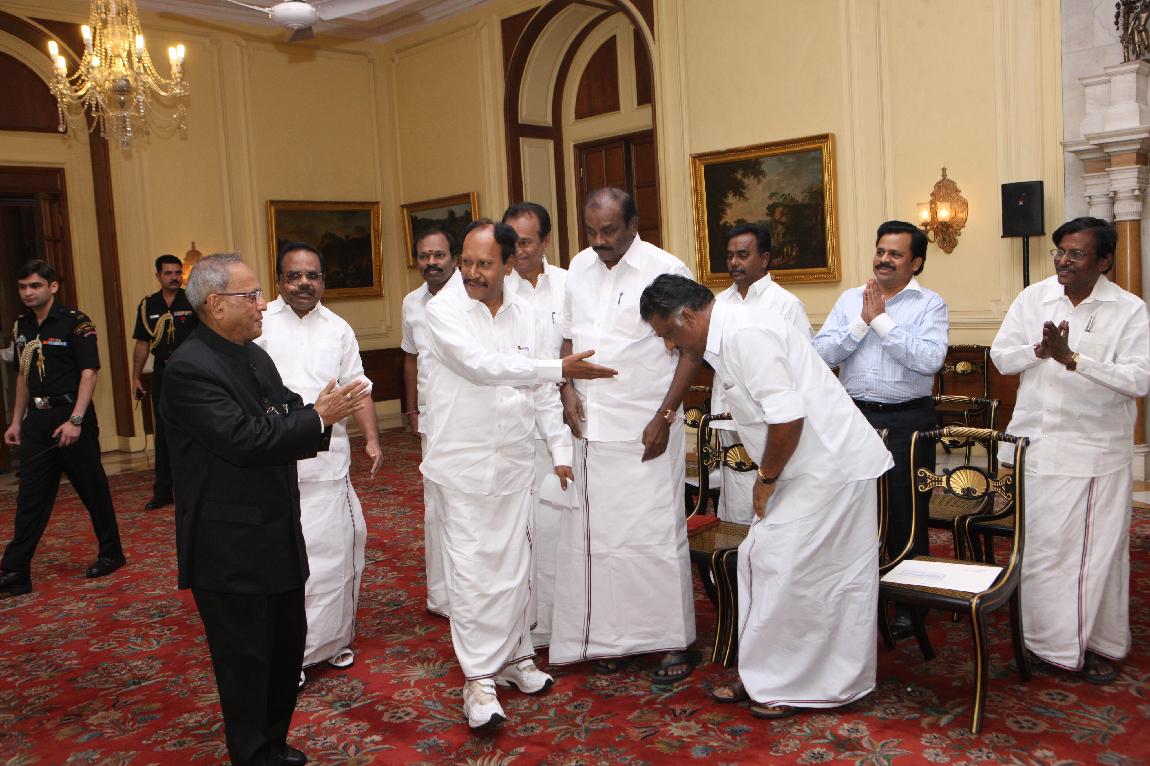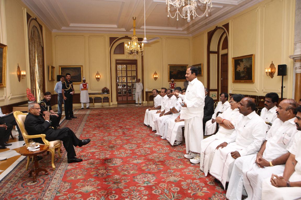 | Caption: | The President of India, Shri Pranab Mukherjee With Shri P Dhanpal Speaker, Tamil Nadu Legislative Assembly Along with a Delegation of Ministers and MPs from Tamil Nadu on October 26, 2012 |