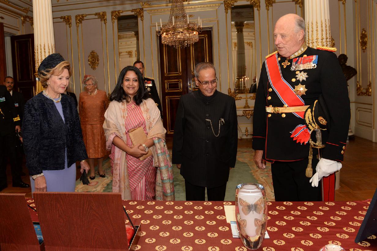 | Caption: | The President of India, Shri Pranab Mukherjee during Exchange of Gifts at Fuglevaerelset (Bird Room) at Oslo in Norway on Oct 13, 2014 |