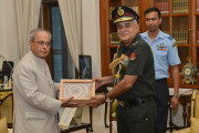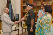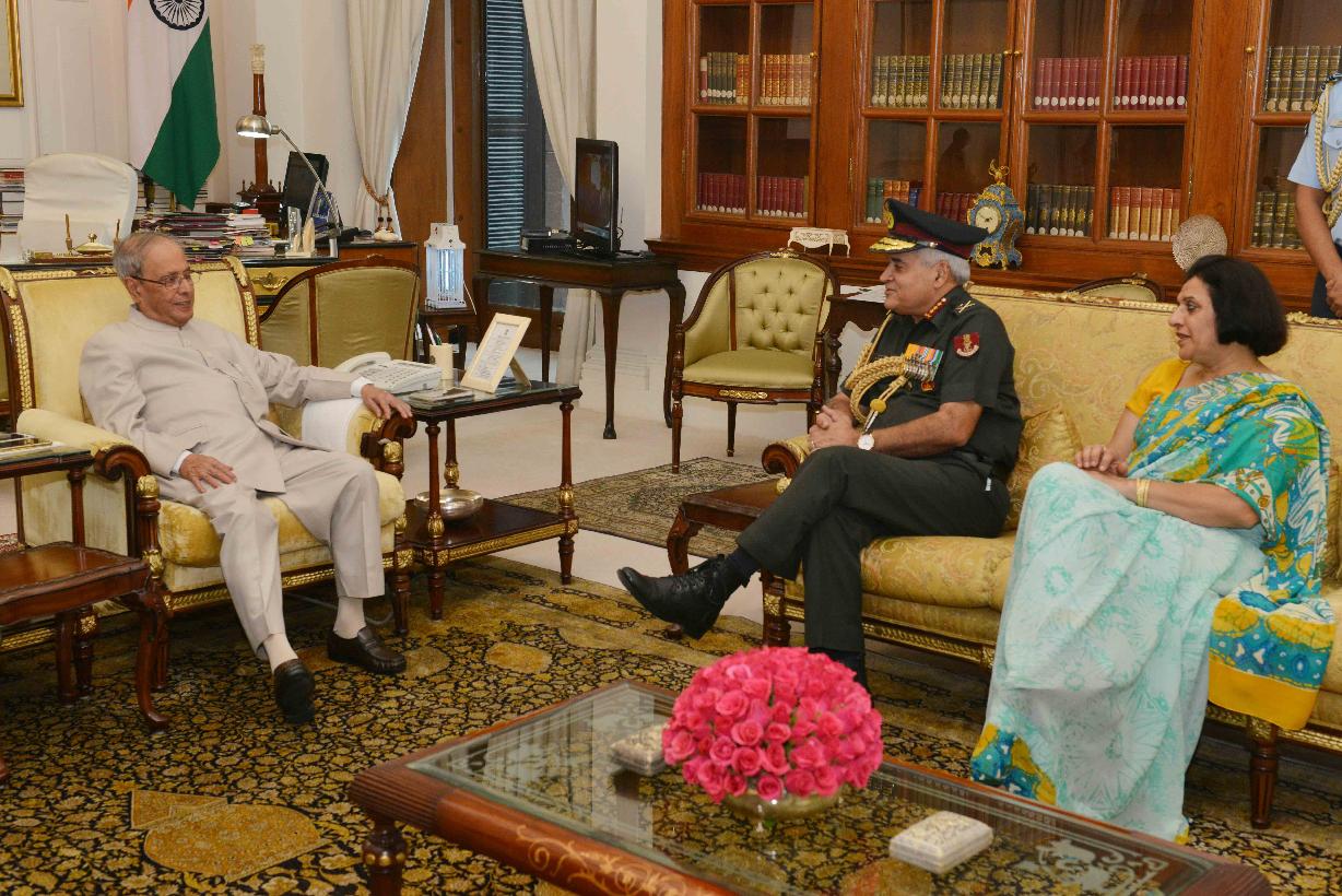 | Caption: | The President of India, Shri Pranab Mukherjee meeting with Lt. Gen. B.K. Chopra, Director General, AFMS & Hony Surgeon to the President alongwith Smt. Vandana Chopra, at Rashtrapati Bhavan on June 20, 2016. |