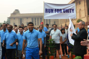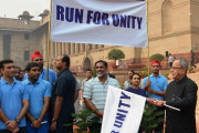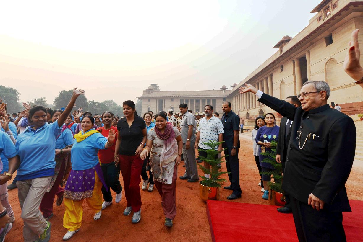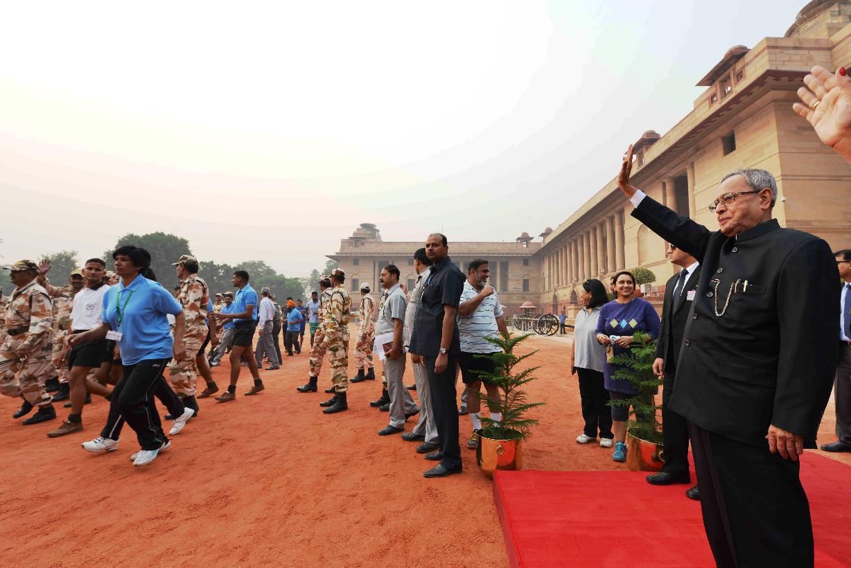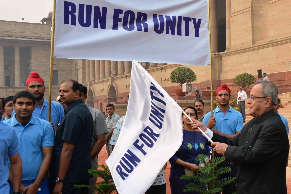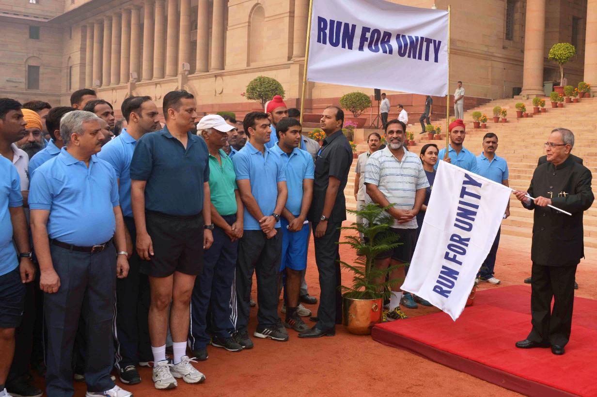 | Caption: | The President of India, Shri Pranab Mukherjee flagging off the Run for Unity at the Forecourt of Rashtrapati Bhavan in New Delhi on Oct 31, 2014 |