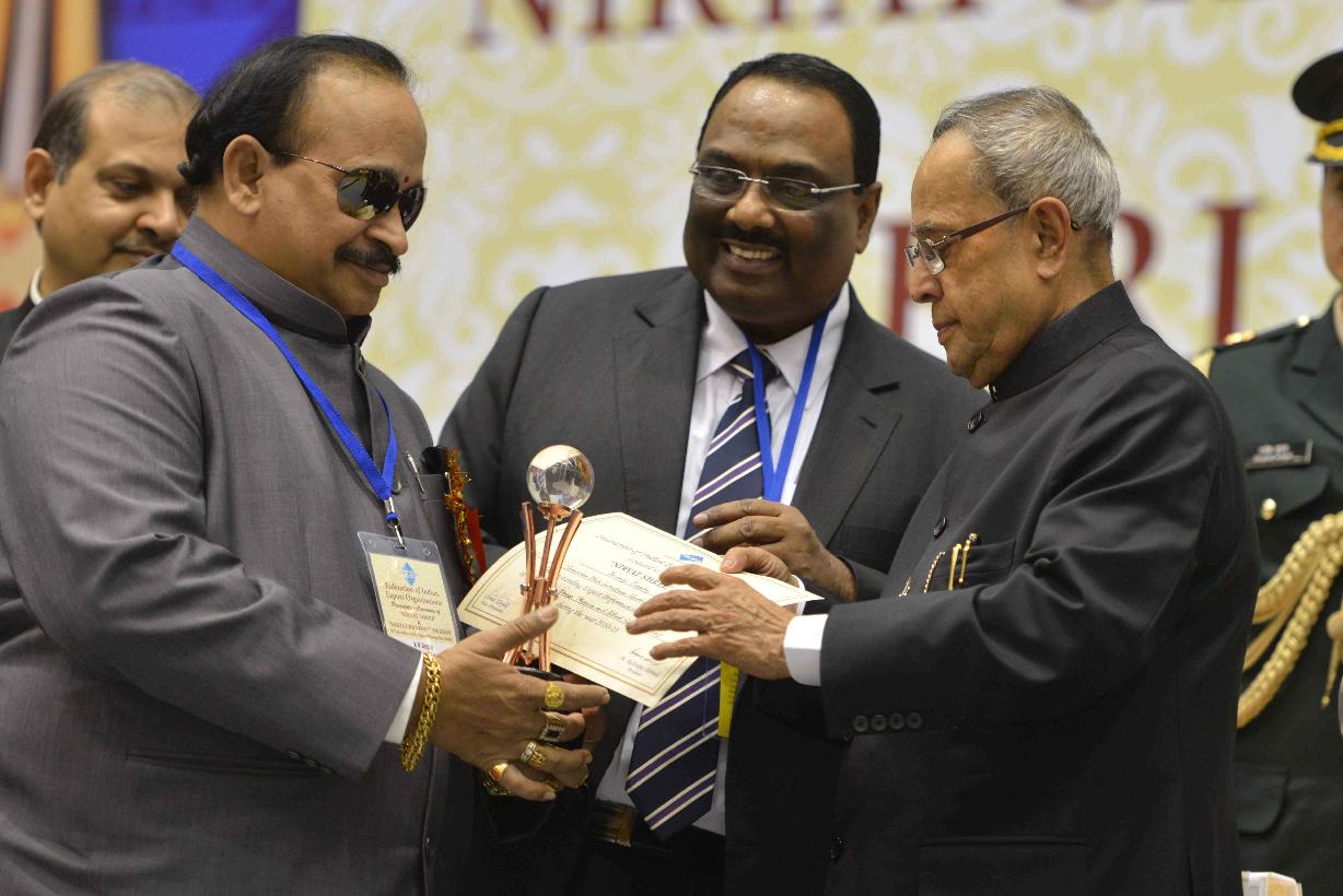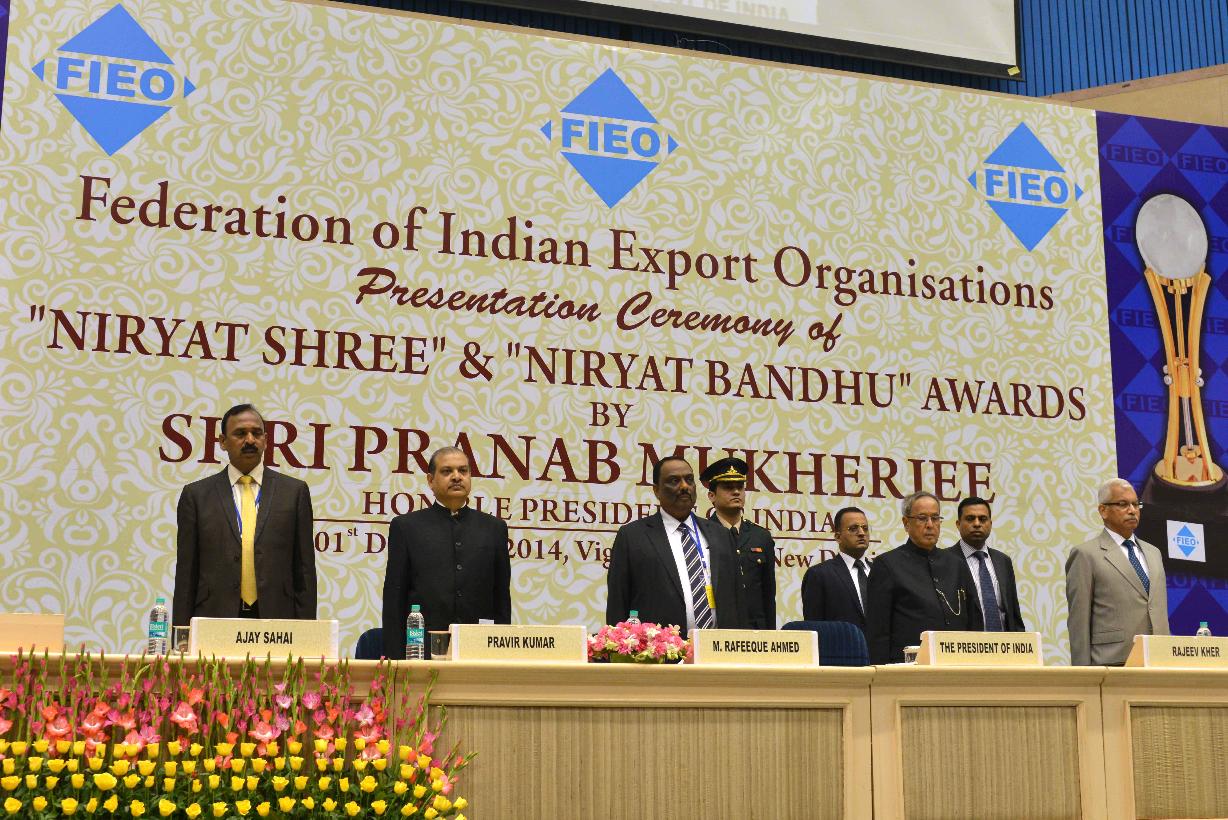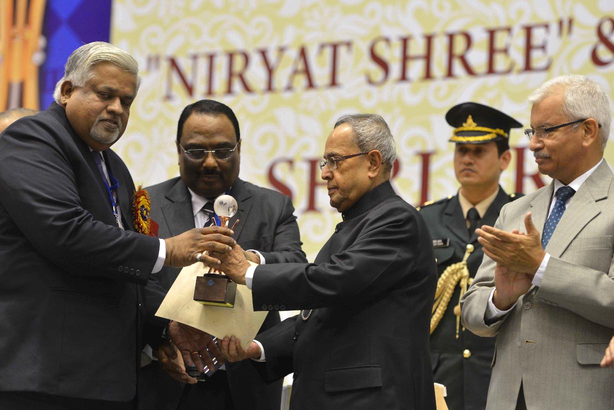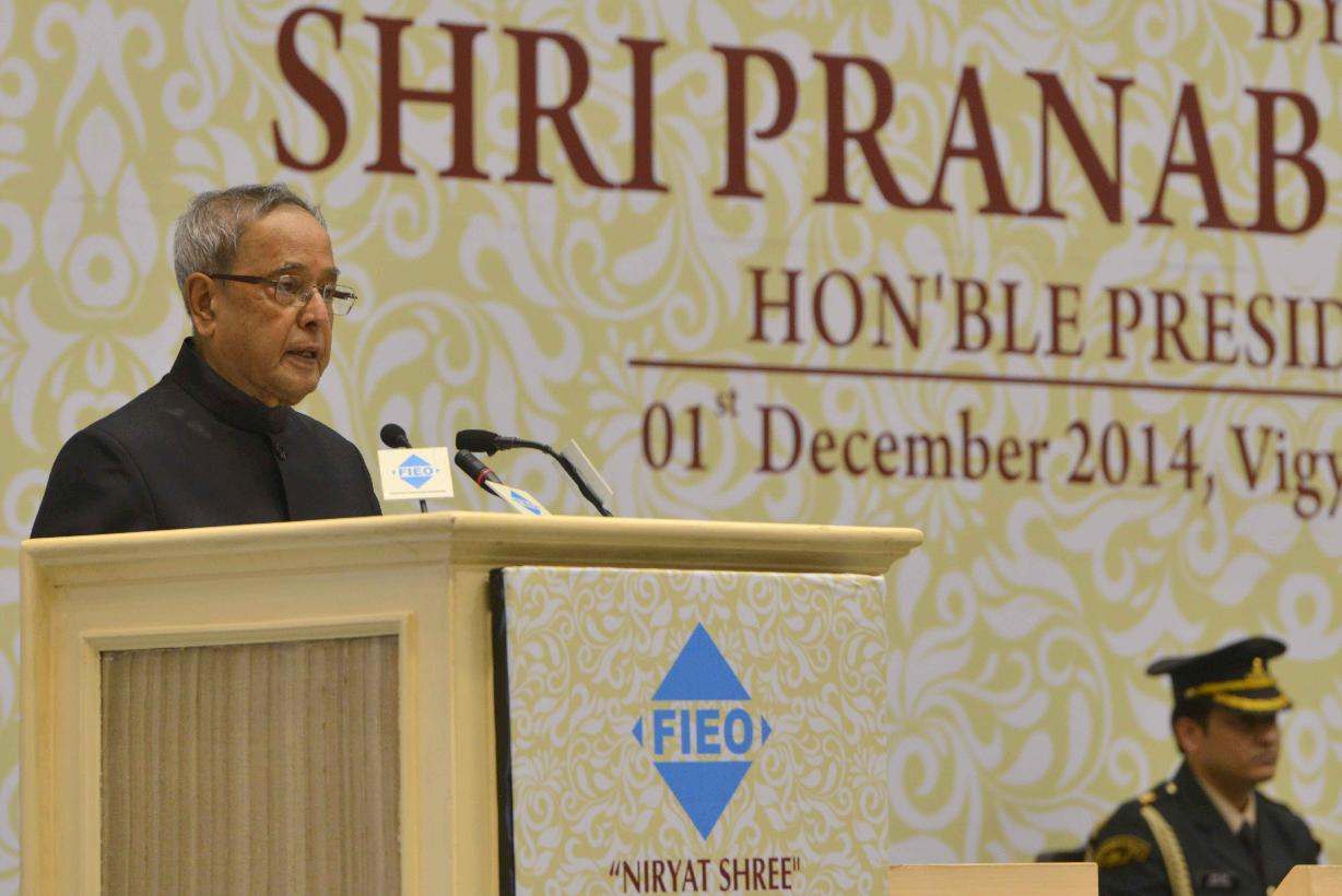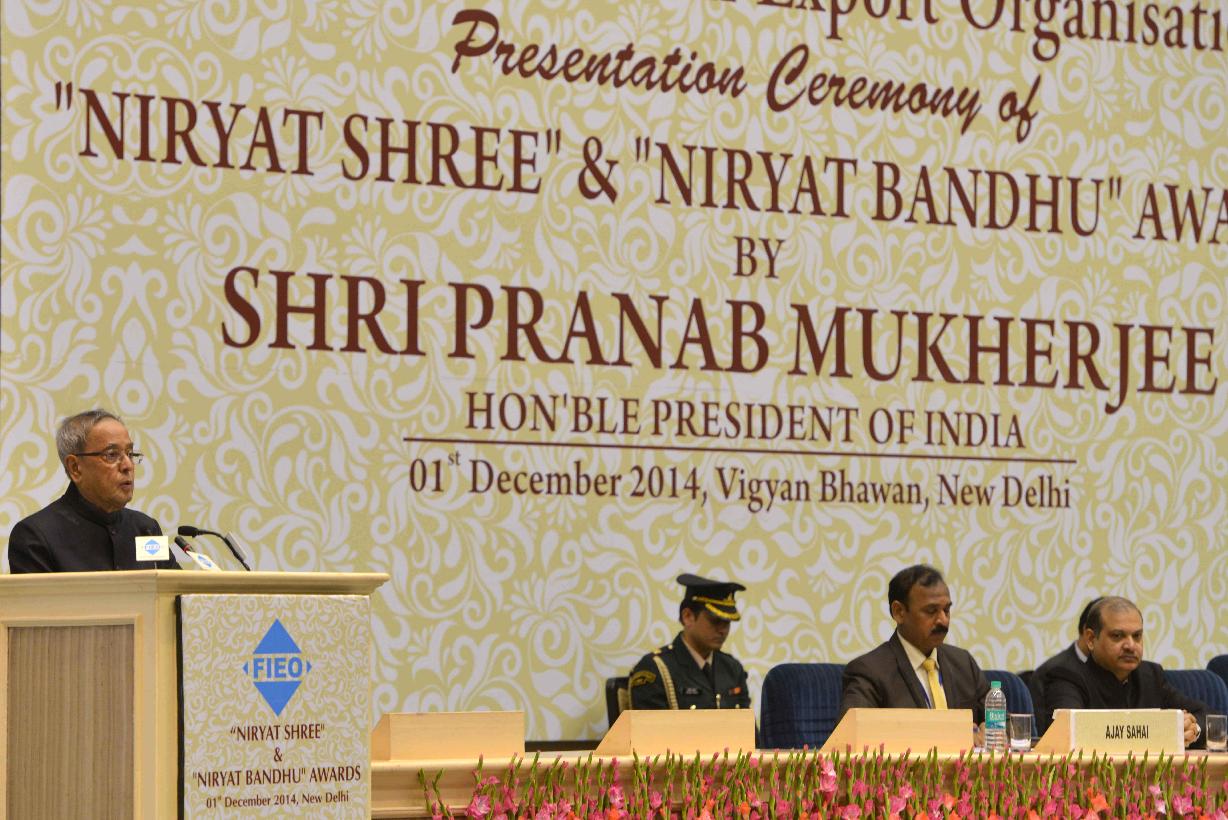 | Caption: | The President of India, Shri Pranab Mukherjee presenting the Niryat Shree and Niryat Bandhu Awards Instituted by the Federation of Indian Export Organizations for Outstanding Performance in Exports for the Year 2010-11 and 2011-12 at Vigyan Bhavan in New Delhi on Dec 01, 2014 |