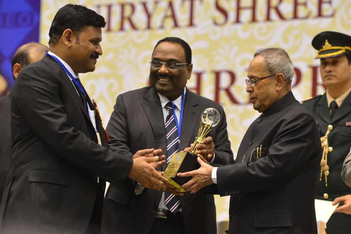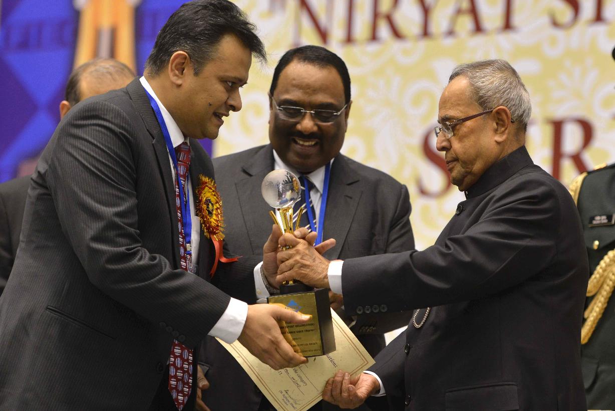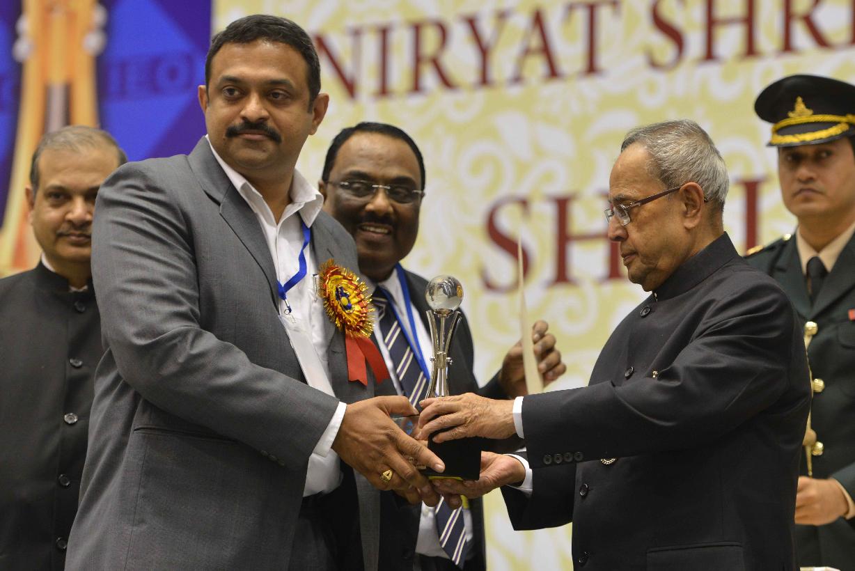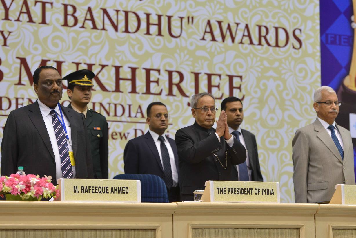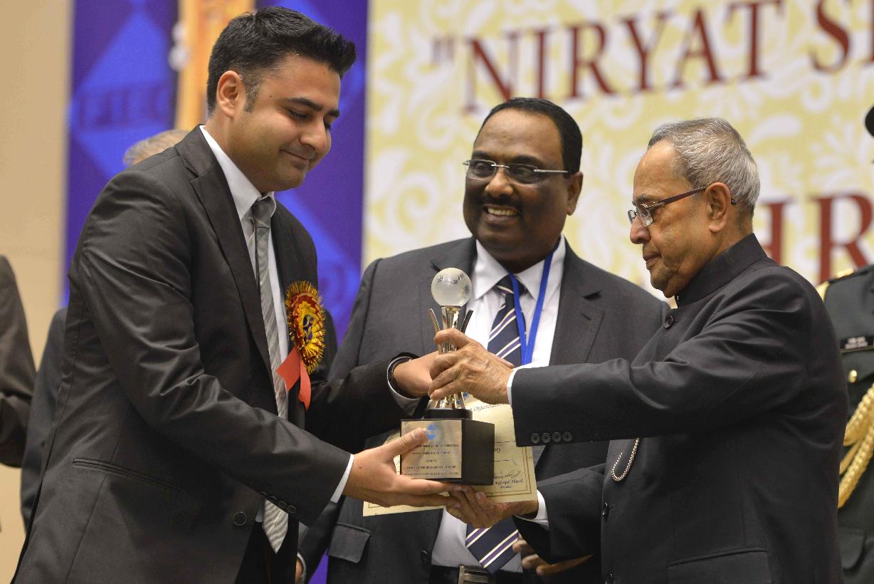 | Caption: | The President of India, Shri Pranab Mukherjee presenting the Niryat Shree and Niryat Bandhu Awards Instituted by the Federation of Indian Export Organizations for Outstanding Performance in Exports for the Year 2010-11 and 2011-12 at Vigyan Bhavan in New Delhi on Dec 01, 2014 |
