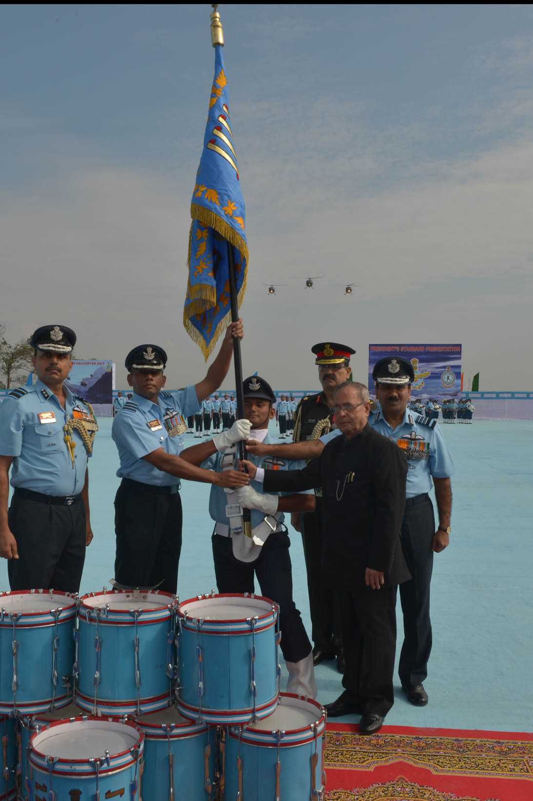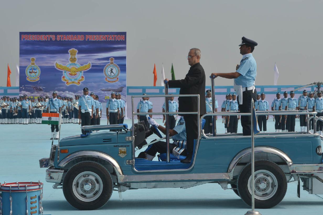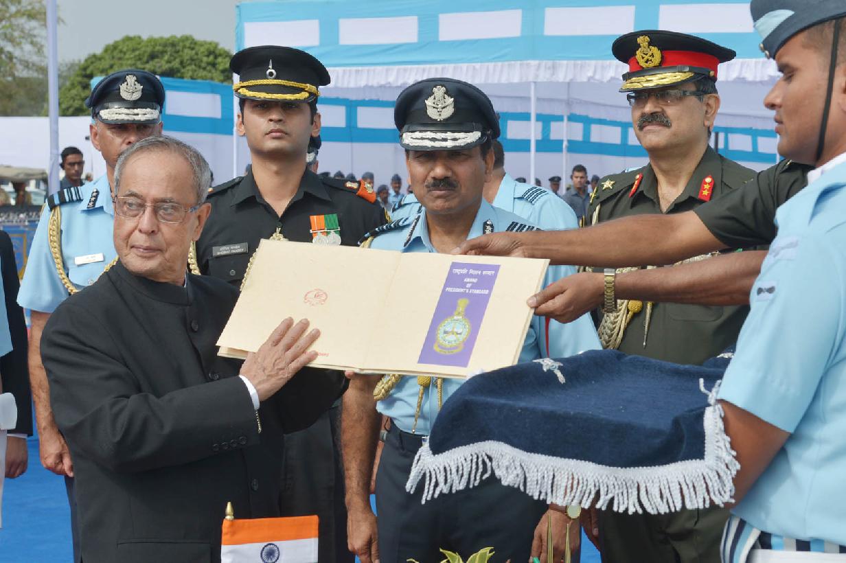 | Caption: | The President of India, Shri Pranab Mukherjee during the Presentation of Standards to 115 HU & 26 Sqn of Indian Air Force at Tezpur in Assam on Nov 21, 2014 |