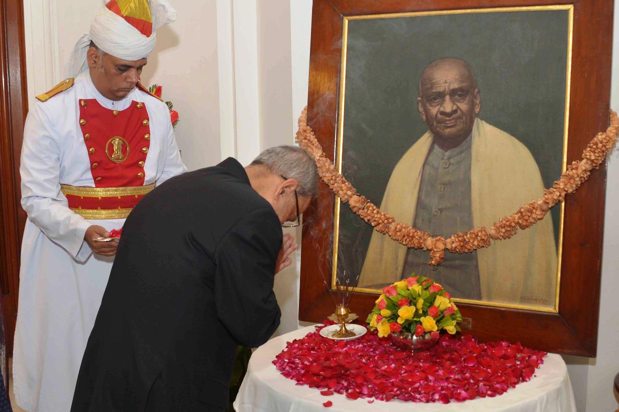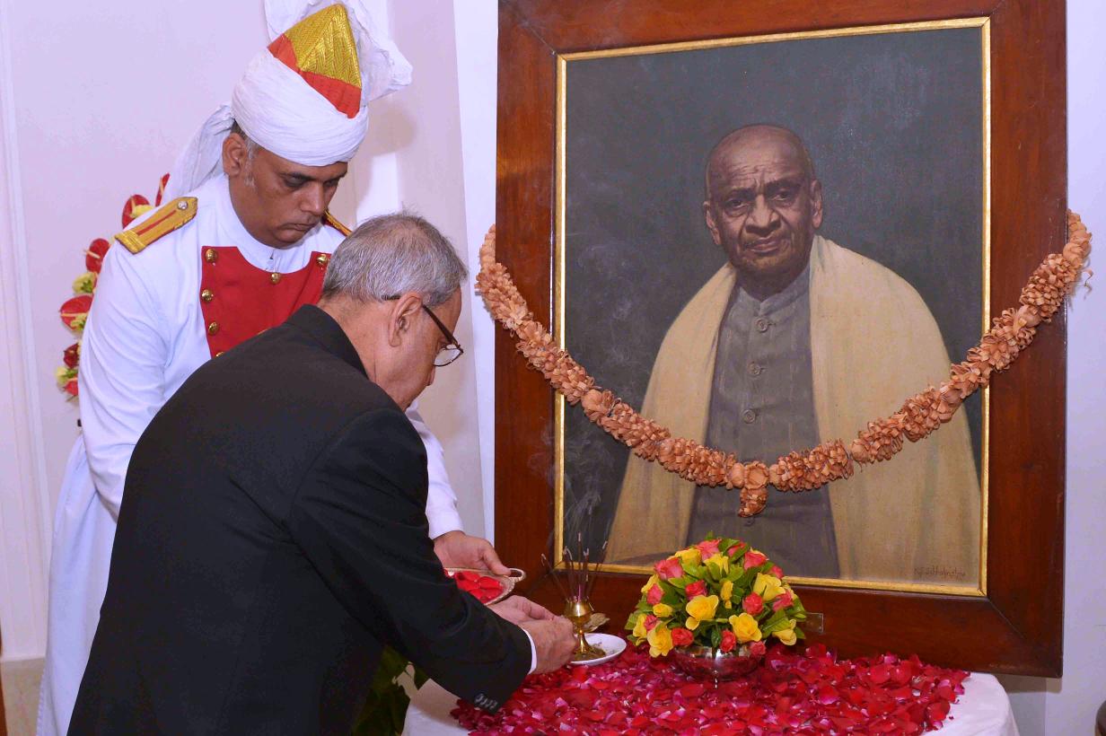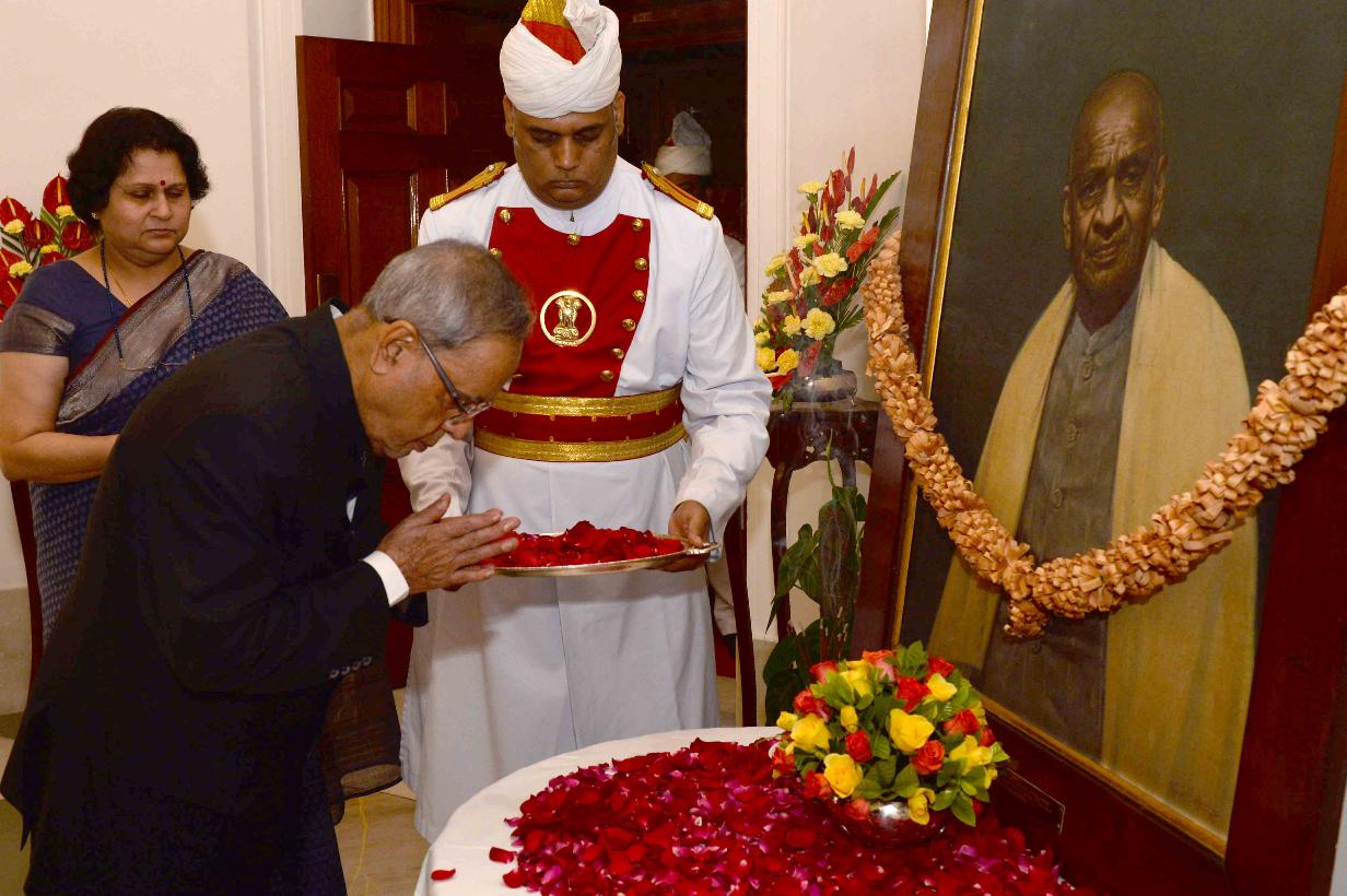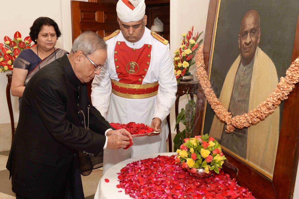 | Caption: | The President of India, Shri Pranab Mukherjee paying floral tributes at the Portrait of Late Shri Sardar Vallabhbhai Patel on his 139 Birth Anniversary at Rashtrapati Bhavan in New Delhi on Oct 31, 2014 |