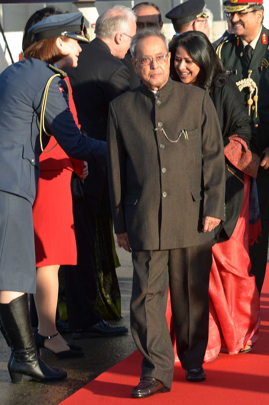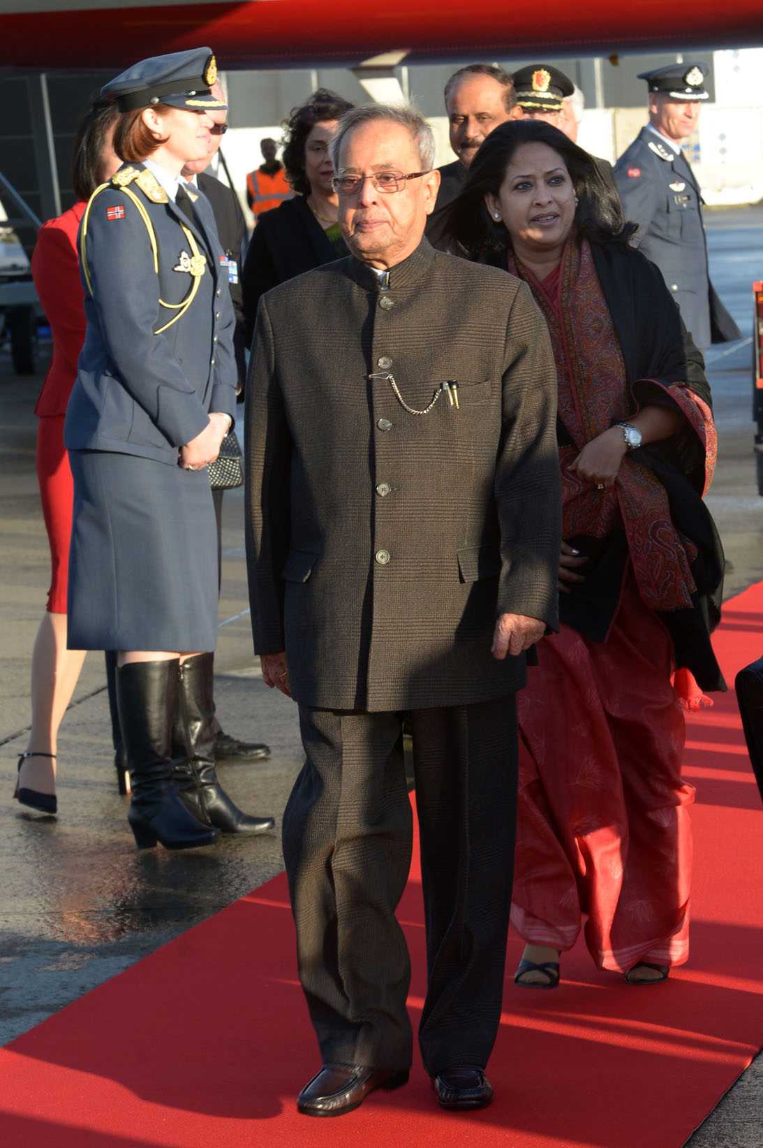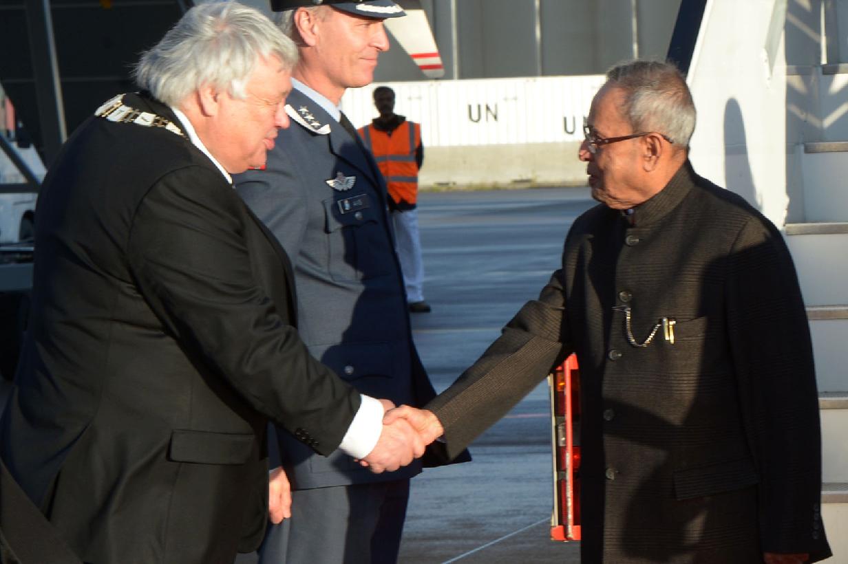 | Caption: | The President of India, Shri Pranab Mukherjee being welcomed by the Mayor of Ullensaker, Mr Harald Espelund at Gardermoen Airbase at Oslo in Norway on Oct 12, 2014 |