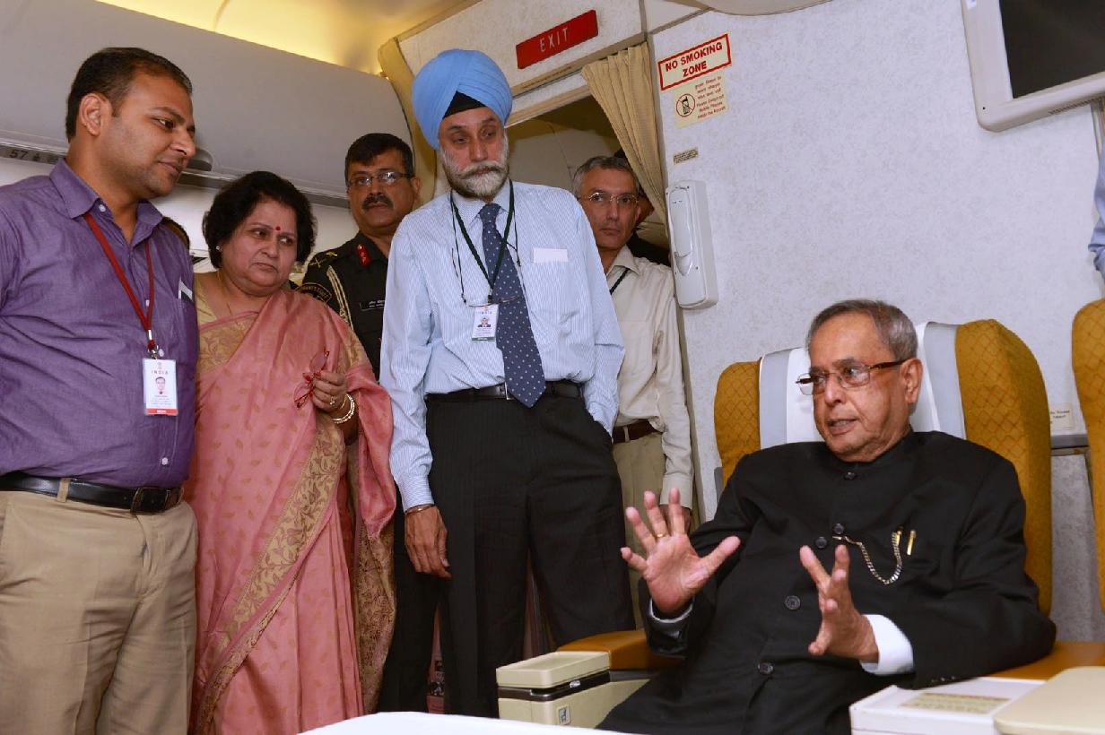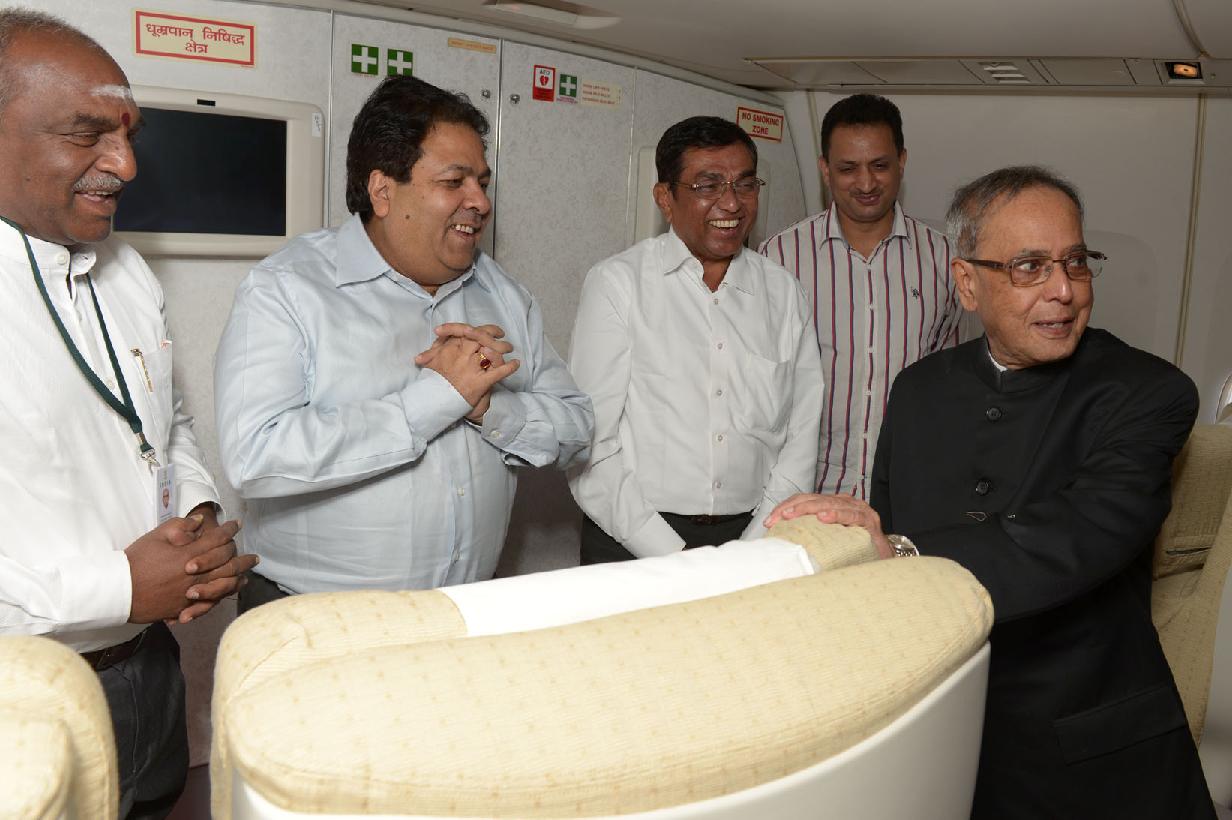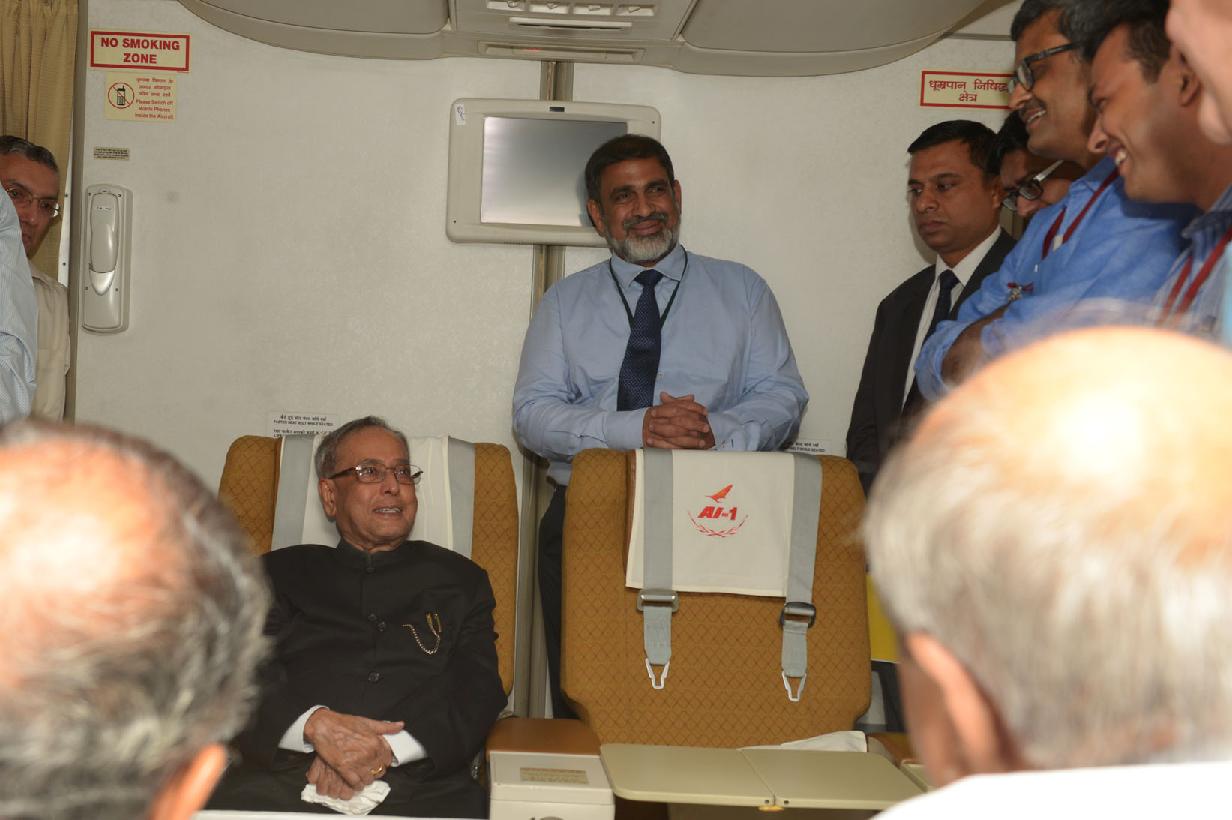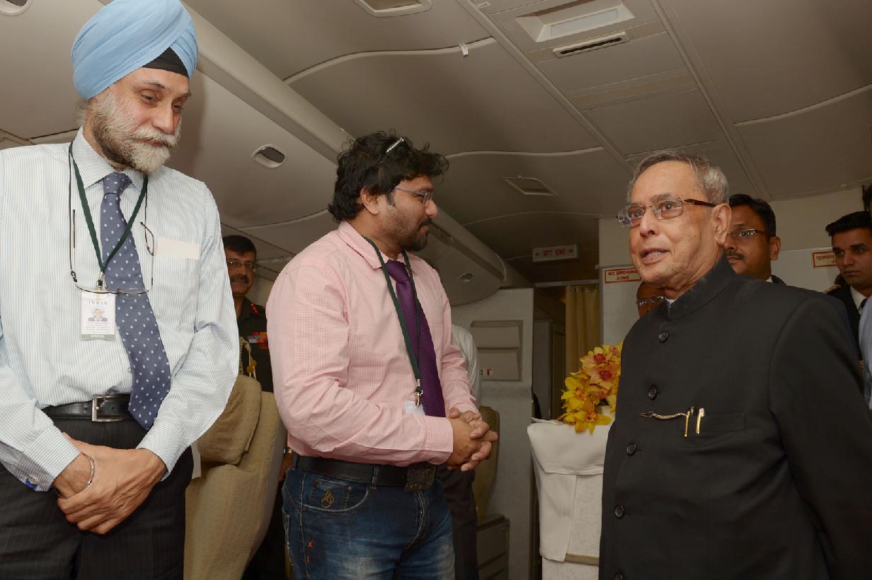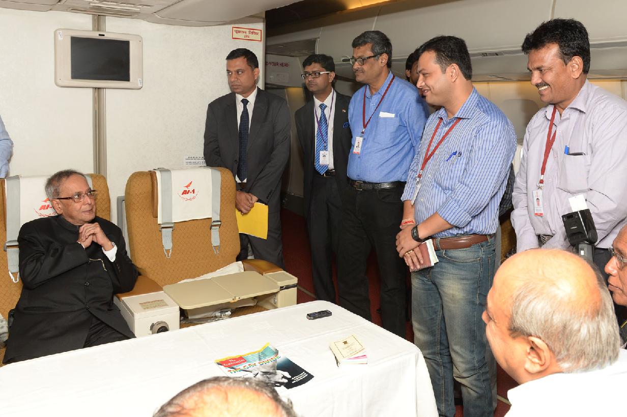 | Caption: | The President of India, Shri Pranab Mukherjee interacting with his Accompanying Media Personnel on Board the Special Aircraft on his way to Norway, Oslo for his State Visits to Norway and Finland on Oct 12, 2014 |