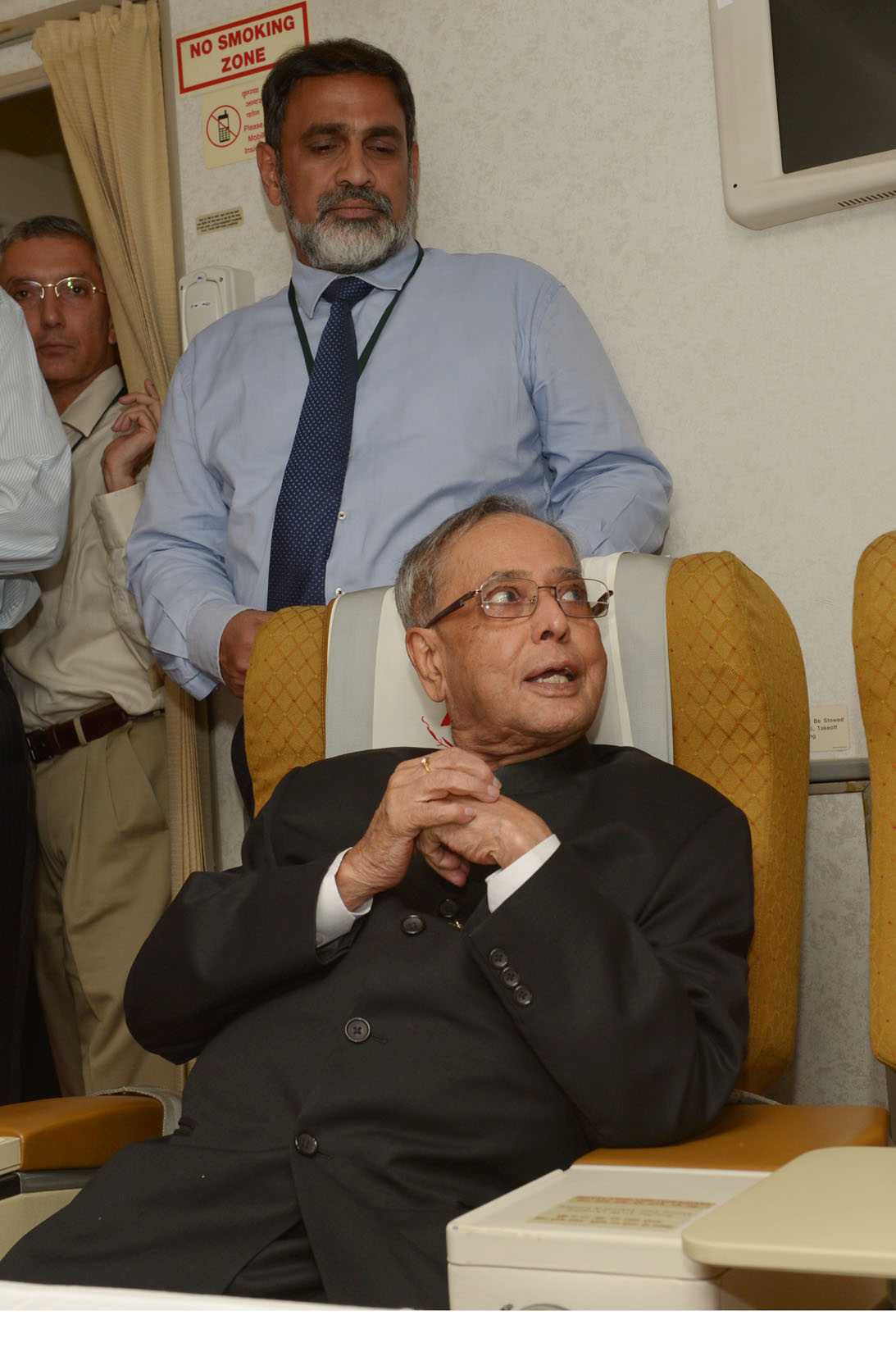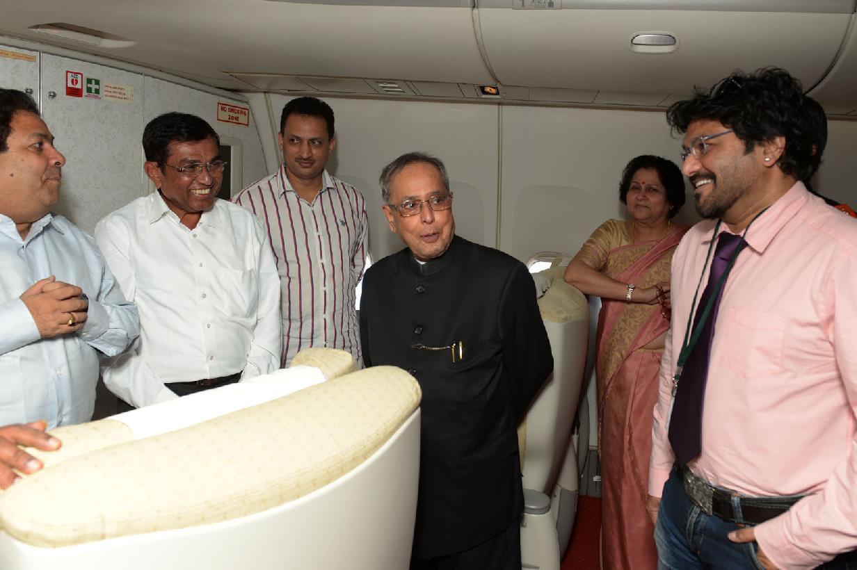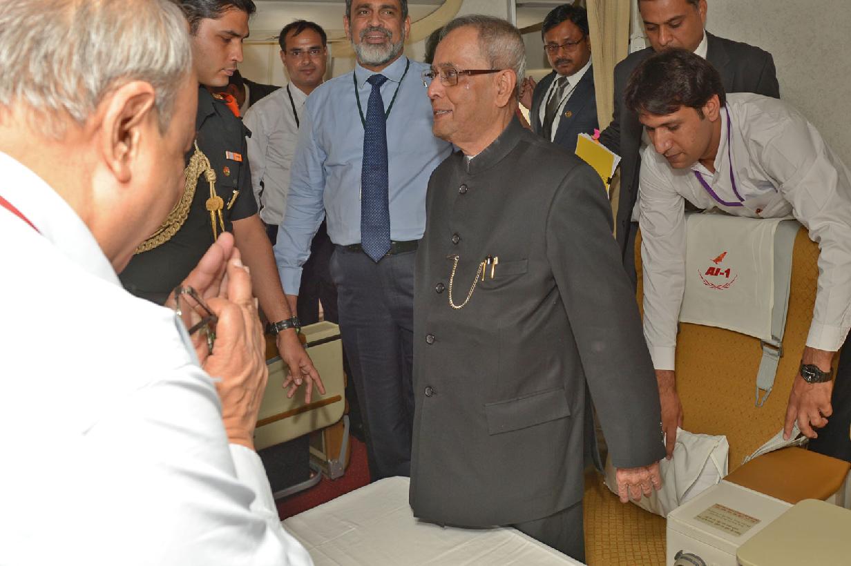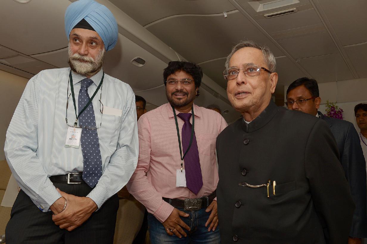 | Caption: | The President of India, Shri Pranab Mukherjee interacting with his Accompanying Media Personnel on Board the Special Aircraft on his way to Norway, Oslo for his State Visits to Norway and Finland on Oct 12, 2014 |