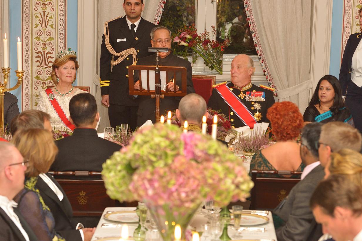 | Caption: | The President of India, Shri Pranab Mukherjee at the Banquet Hosted in Honour of the King of Norway, His Majesty King Harald V at Royal Palace at Oslo in Norway on Oct 13, 2014 |
