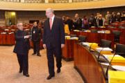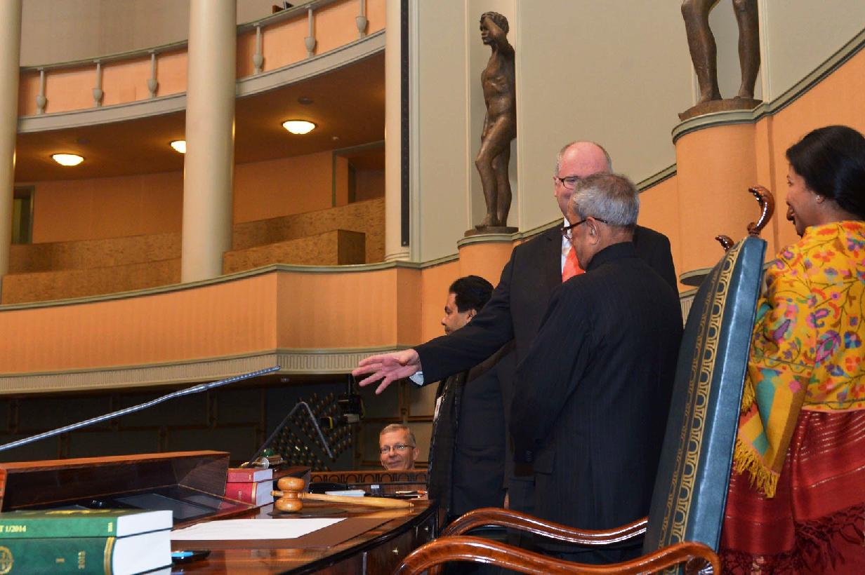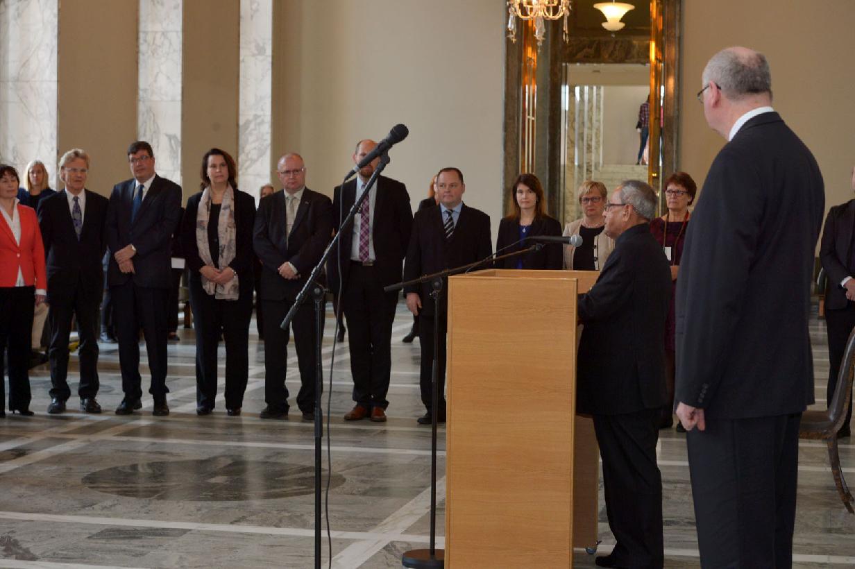 | Caption: | The President of India, Shri Pranab Mukherjee addressing at the Parliament of Finland, HE Mr Eero Heinaluoma, Speaker of Parliament of Finland Escorted him for going around Central Hall of Parliament and also attended a Delegation Level Talks at Helsinki in Finland on Oct 16, 2014 |