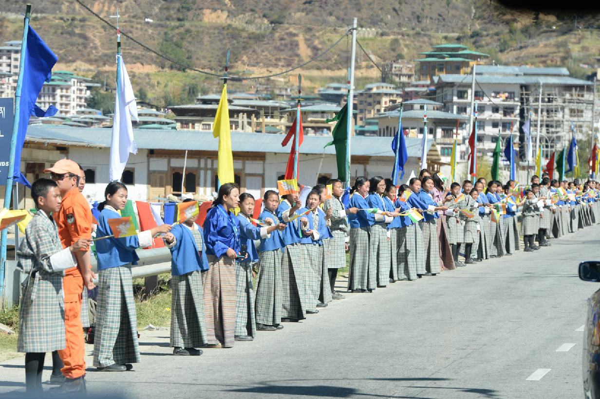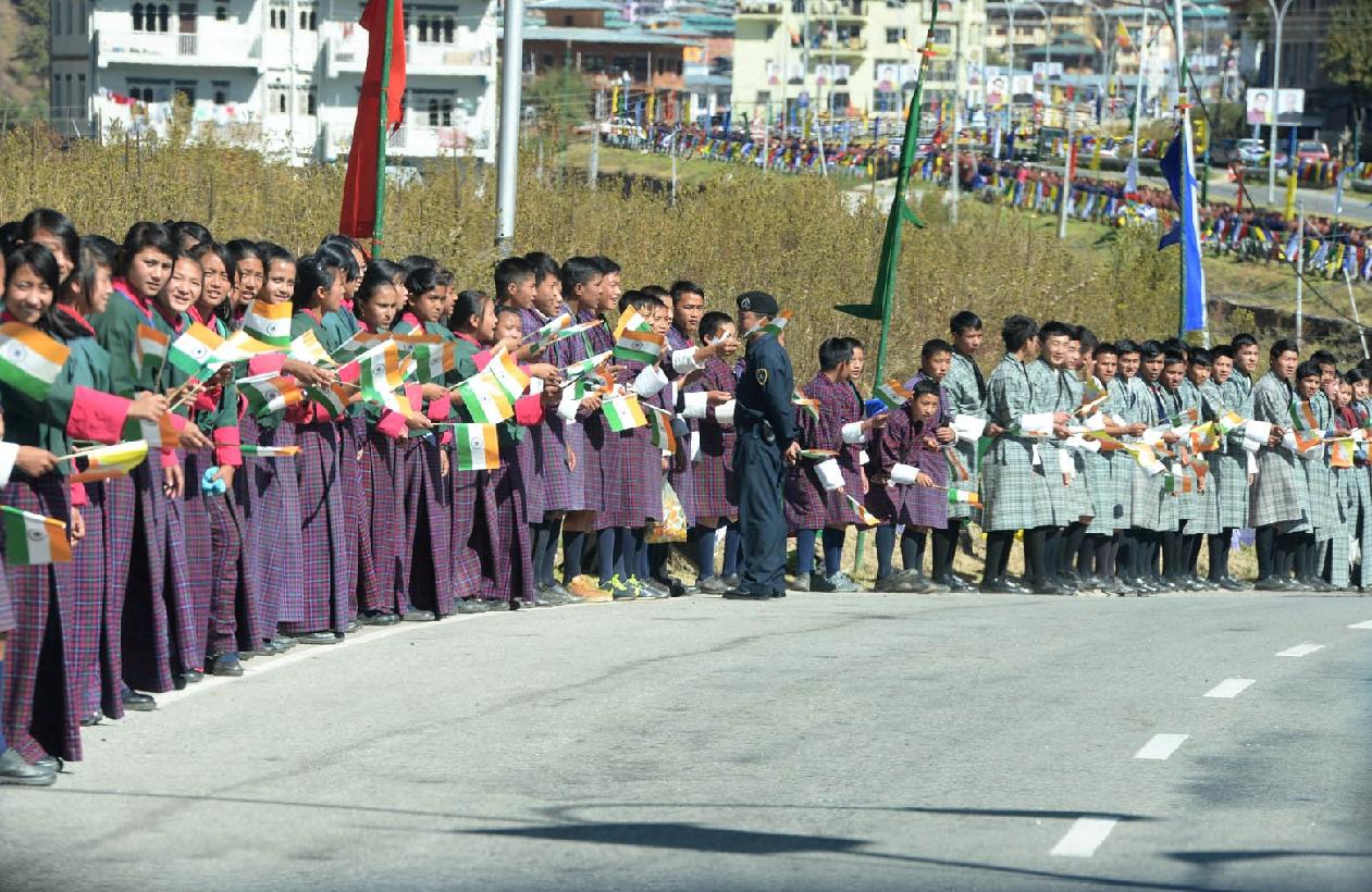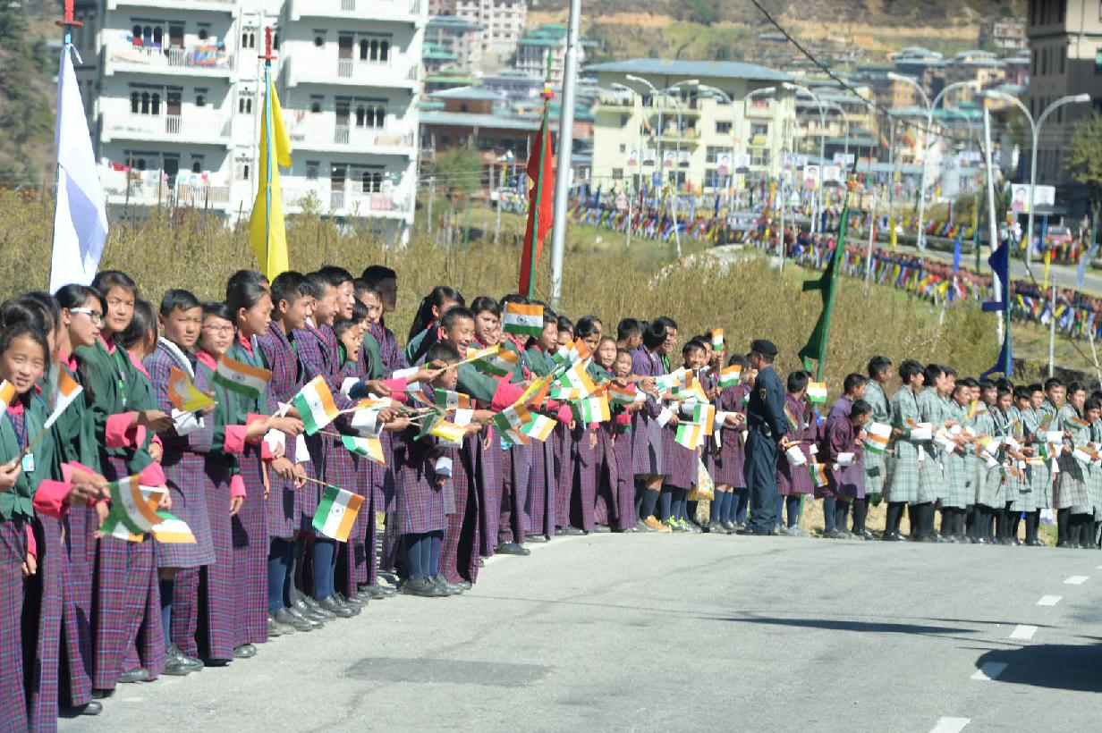 | Caption: | The President of India, Shri Pranab Mukherjee being welcomed by the School Children of Bhutan at Thimphu in Bhutan on Nov 08, 2014 |
