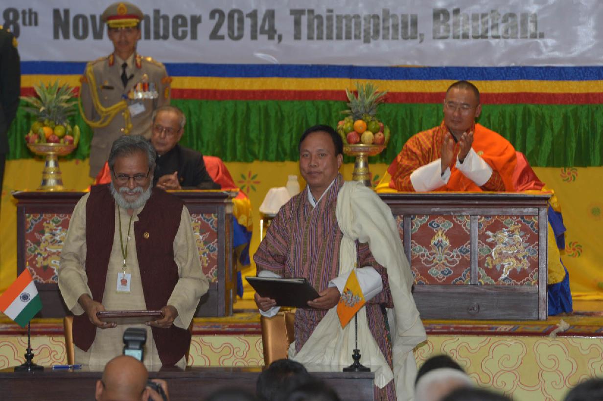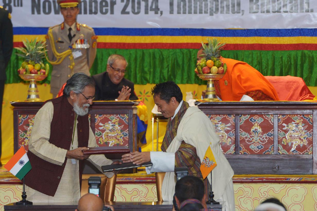 | Caption: | The President of India, Shri Pranab Mukherjee with the Prime Minister of Bhutan, HE Mr Tshering Tobgay to witnessing the signing of Educational MoUs between the Bhutan and India at Thimphu in Bhutan on Nov 08, 2014 |