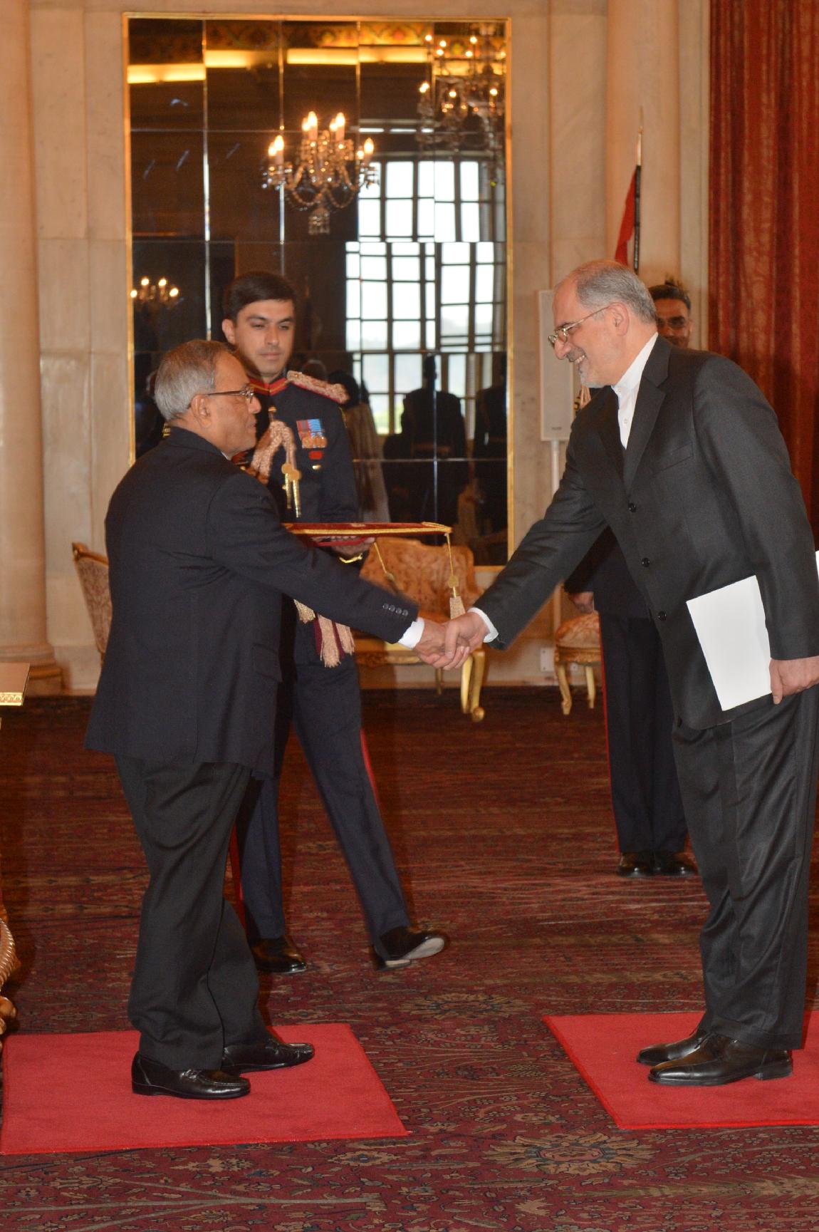 | Caption: | The President of India, Shri Pranab Mukherjee Meeting with HE Mr Gholamreza Ansari Ambassador Designate of the Islamic Republic of Iran on 22 Jan 2013 |