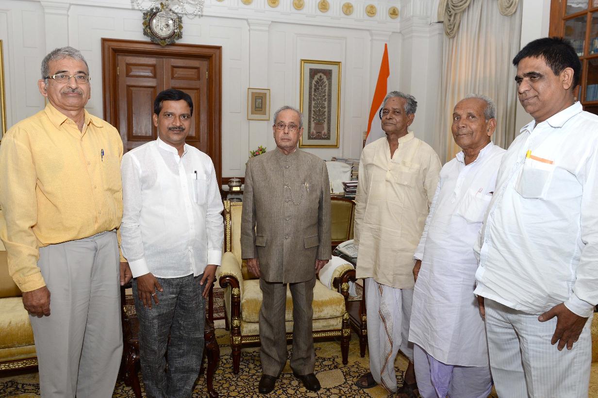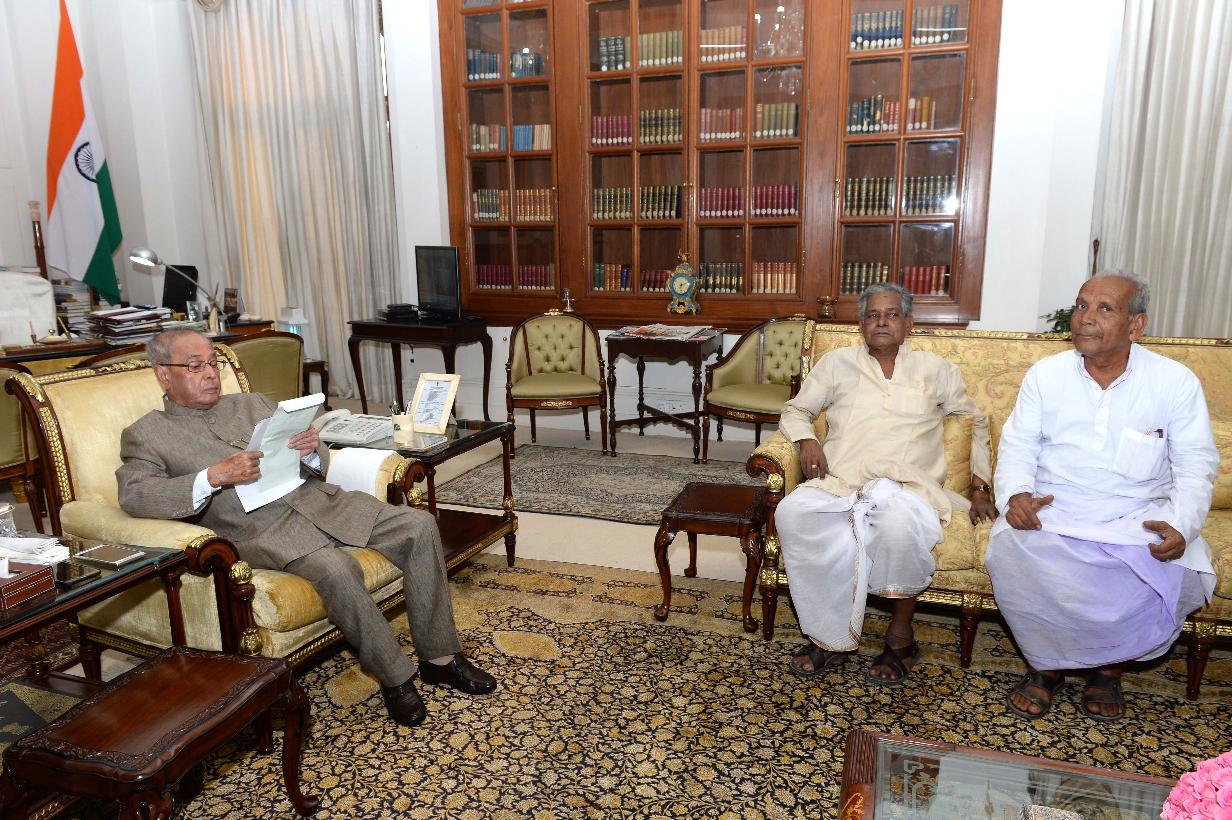 | Caption: | The President of India, Shri Pranab Mukherjee meeting with Shri Bangshi Gopal Dey, Shri Dhiren Layek and others from Bankura District, at Rashtrapati Bhavan on May 04, 2017. |