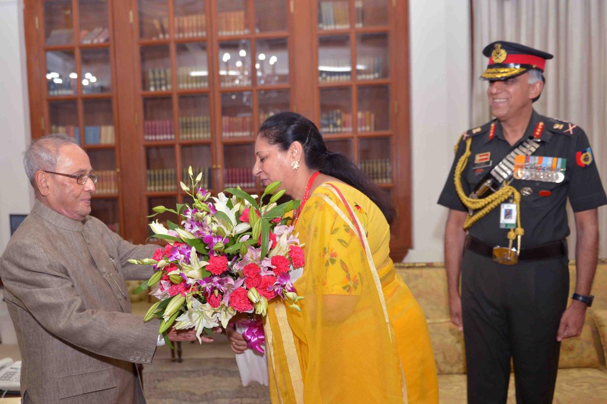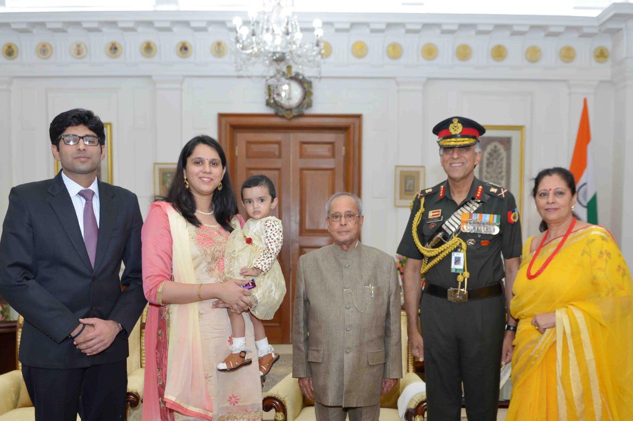 | Caption: | The President of India, Shri Pranab Mukherjee meeting with Lt. Gen. Vinod Vashisht, Director General, National Cadets Corps & Senior Colonel Commandant Regiment of Artillery and Hony ADC to the President along with his family members, at Rashtrapati Bhavan on May 04, 2017. |