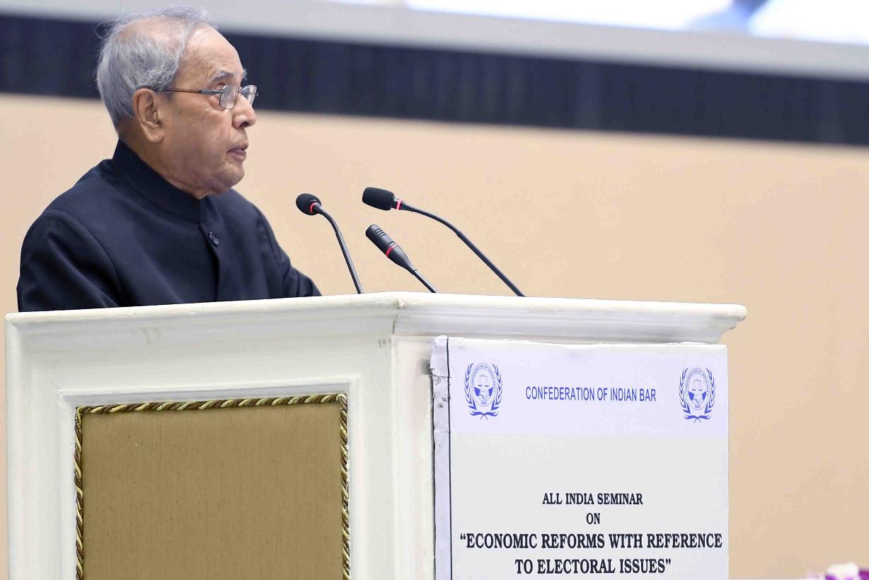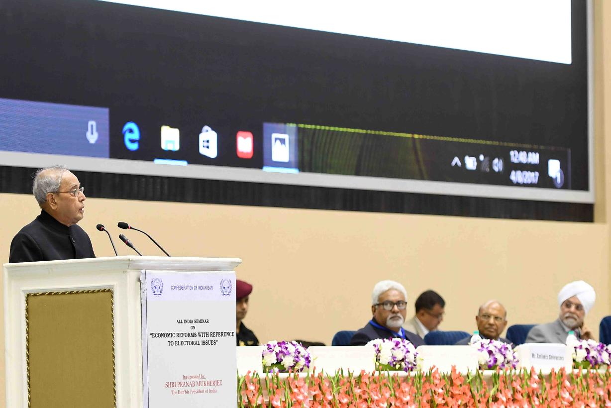 | Caption: | The President of India, Shri Pranab Mukherjee addressing at the inauguration of an All India Seminar on Economic Reforms with Reference to Electoral Issues , organised by the Confederation of the Indian Bar, in New Delhi on April 08, 2017. |