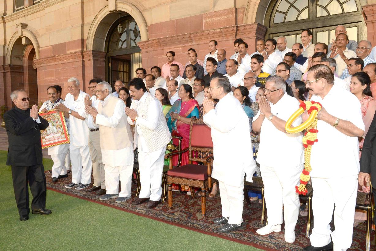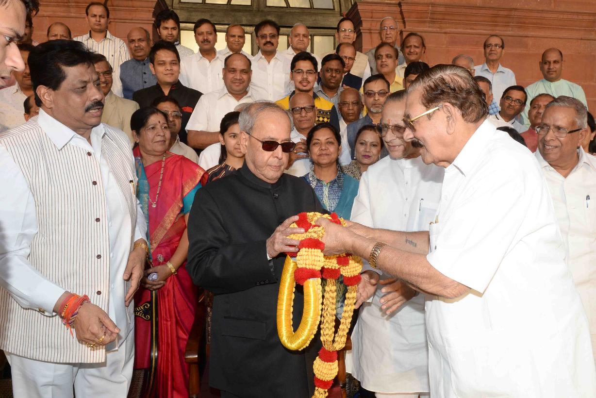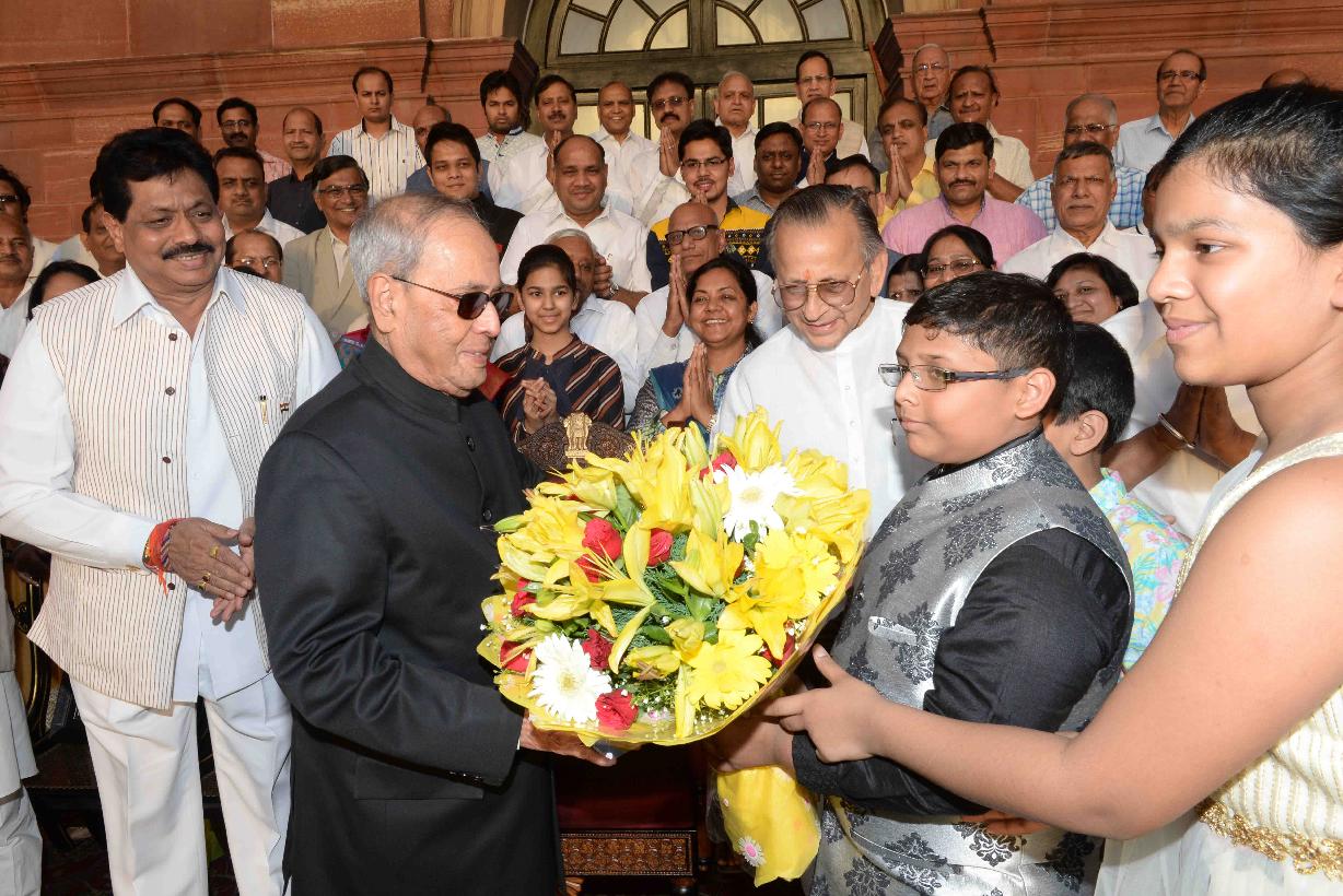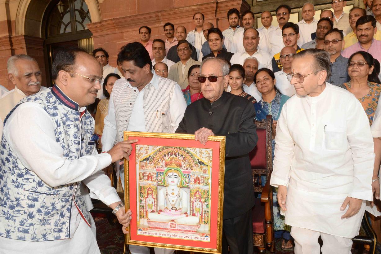 | Caption: | The President of India, Shri Pranab Mukherjee meeting with Shri Dilip Gandhi, MP (LS) alongwith a delegation from Bhagwan Mahavir Jayanti Mahotsava Mahasamiti, Shri All India Shwetambar Sthanakvasi Jain Conference, Delhi Pradesh, on the occasion of Mahavir Jayanti, at Rashtrapati Bhavan on April 08, 2017. |