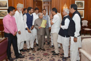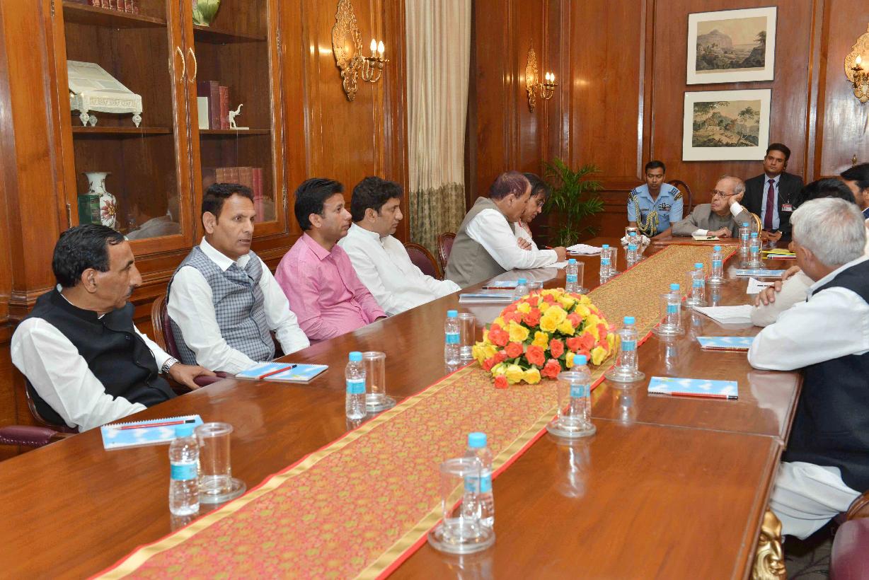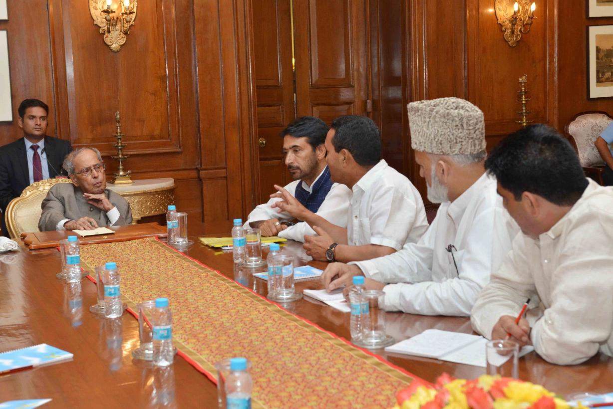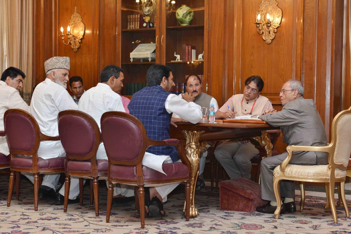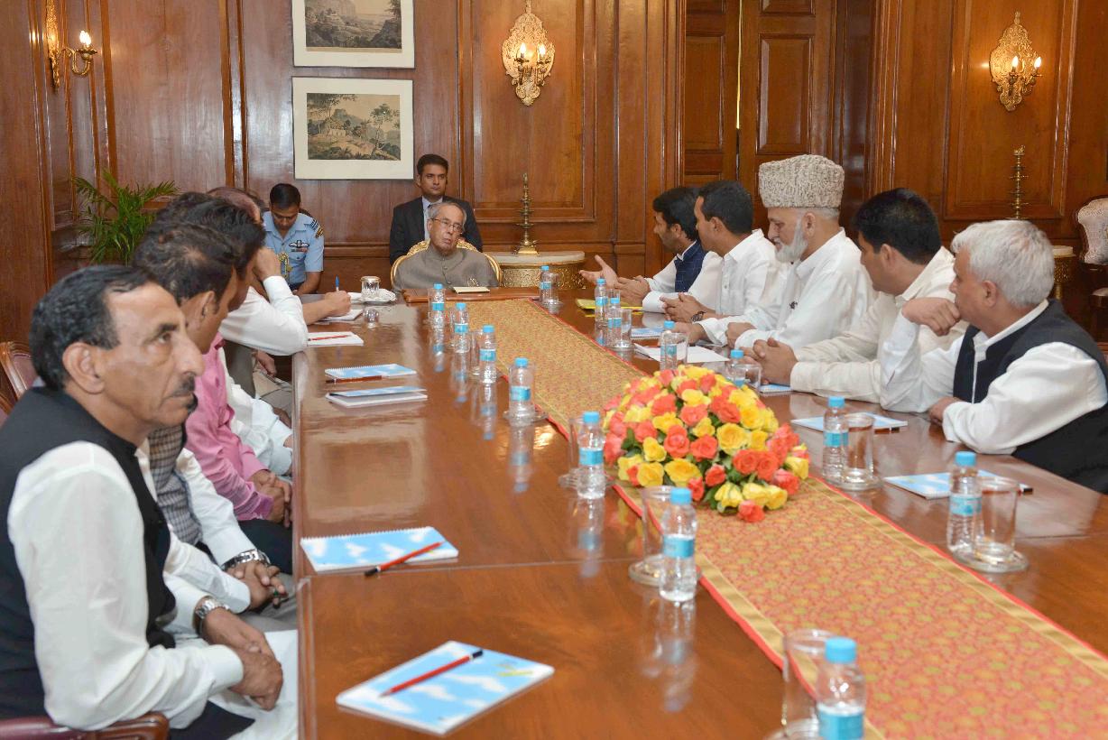 | Caption: | The President of India, Shri Pranab Mukherjee meeting with a delegation of Office Bearers of J&K Pradesh Congress Committee and MLAs & MLC of National Conference Led by Shri G.A. Mir, President, J&K Pradesh Congress Committee, at Rashtrapati Bhavan on April 19, 2017. |