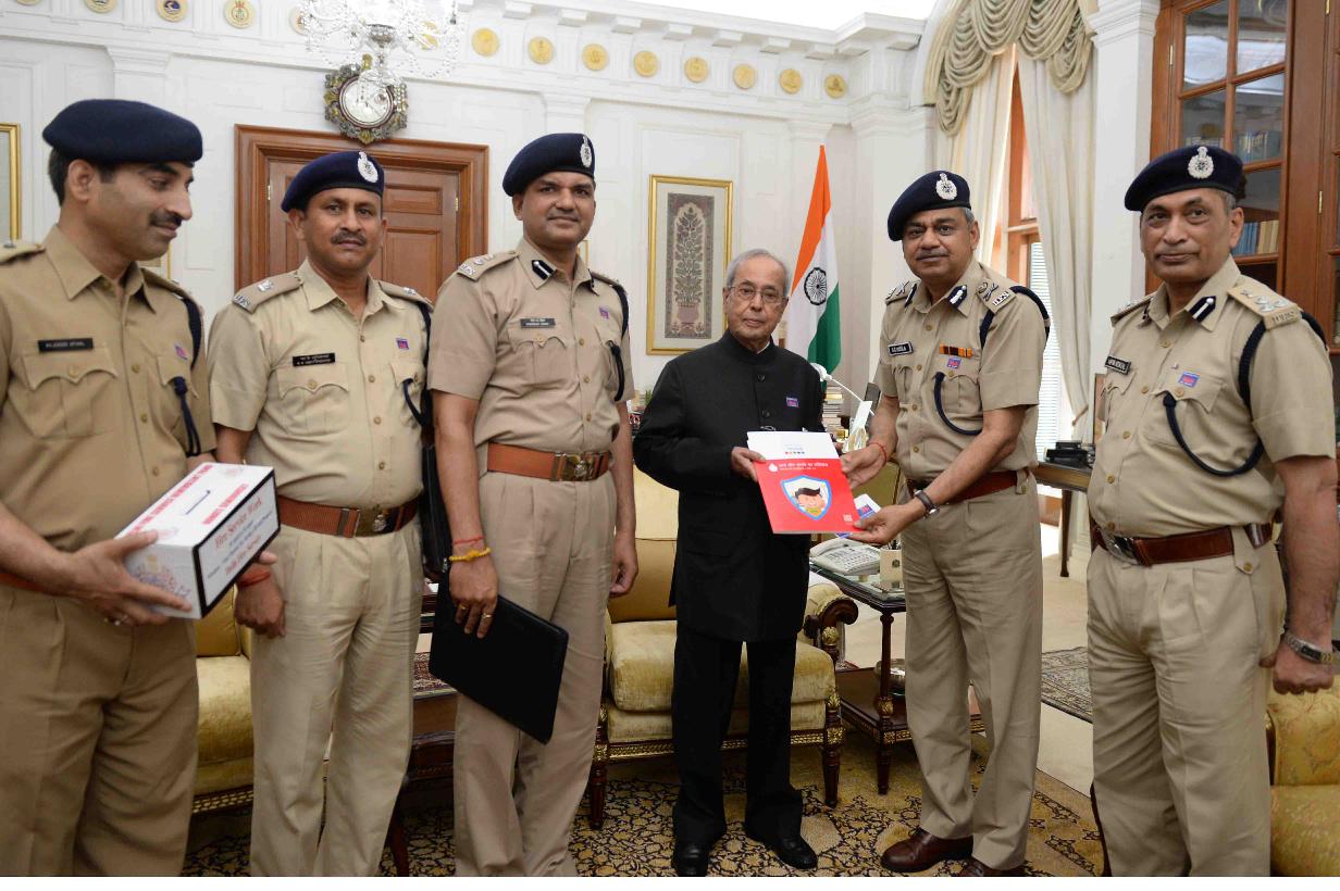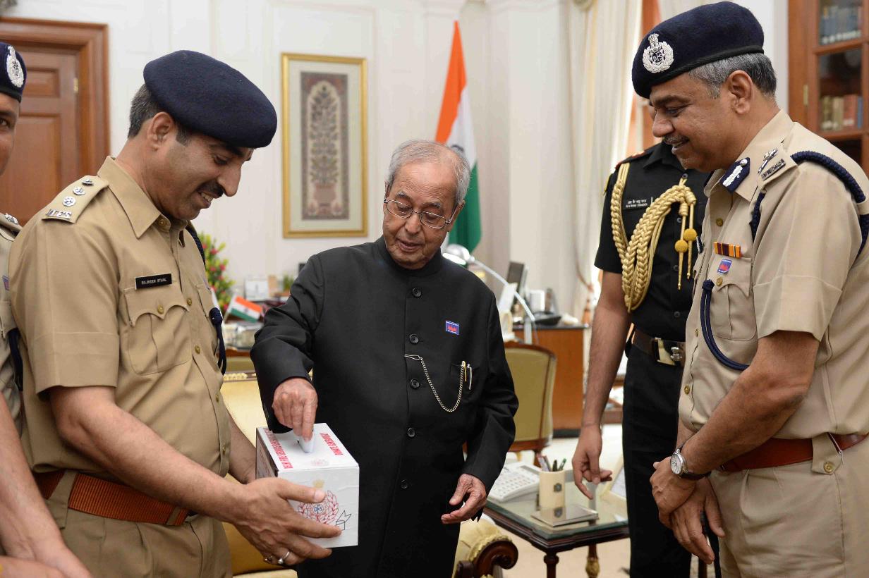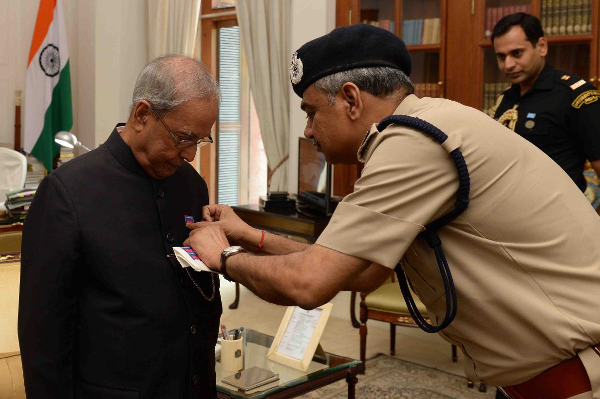 | Caption: | The President of India, Shri Pranab Mukherjee being pinned a flag by Shri G.C. Misra, Director with other officers from Delhi Fire Service on the occasion of Fire Service Week, at Rashtrapati Bhavan on April 18, 2017. |