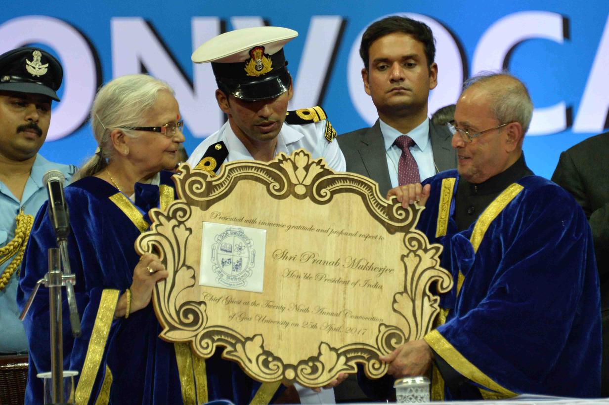 | Caption: | The President of India, Shri Pranab Mukherjee being conferred the Honorary D. Litt. degree by Goa University, at its Annual Convocation, in Goa on April 25, 2017. |