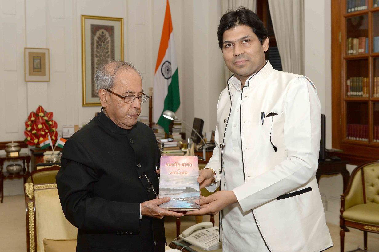 | Caption: | The President of India, Shri Pranab Mukherjee receiving a book ''Ramcharitmanas Mey Charitra'' from Shri Yogesh Dubey, at Rashtrapati Bhavan on April 20, 2017. |