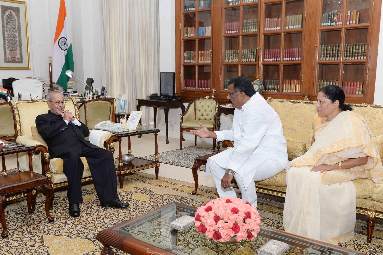 | Caption: | The President of India, Shri Pranab Mukherjee meeting with Shri Kotla Jaya Surya Prakash Reddy, former MoS for Railways alongwith his wife Smt. Kotla Sujatha Reddy, Ex-MLA, Shri Chandrasekhar Reddy, Ex-MLC and Shri Srinivas Sharma, at Rashtrapati Bhavan on May 25, 2017. |