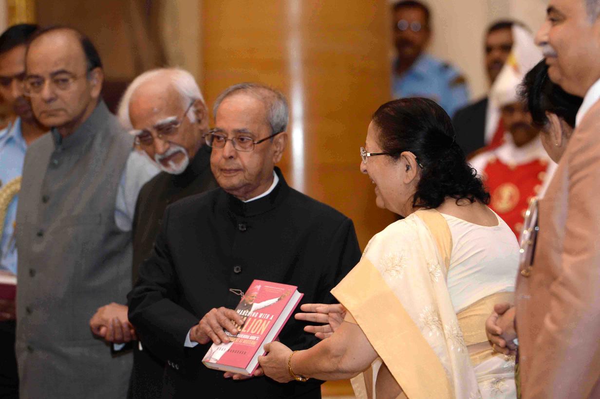 | Caption: | The President of India, Shri Pranab Mukherjee receiving the first copy of the Books 'Mann Ki Baat - A Social Revolution on Radio' brought out by the BlueKraft Digital Foundation and 'Marching with a Billion - Analysing Narendra Modi's Government at Midterm' authored by Shri Uday Mahurkar from the Speaker of Lok Sabha, Smt. Sumitra Mahajan, at Rashtrapati Bhavan on May 26, 2017. |