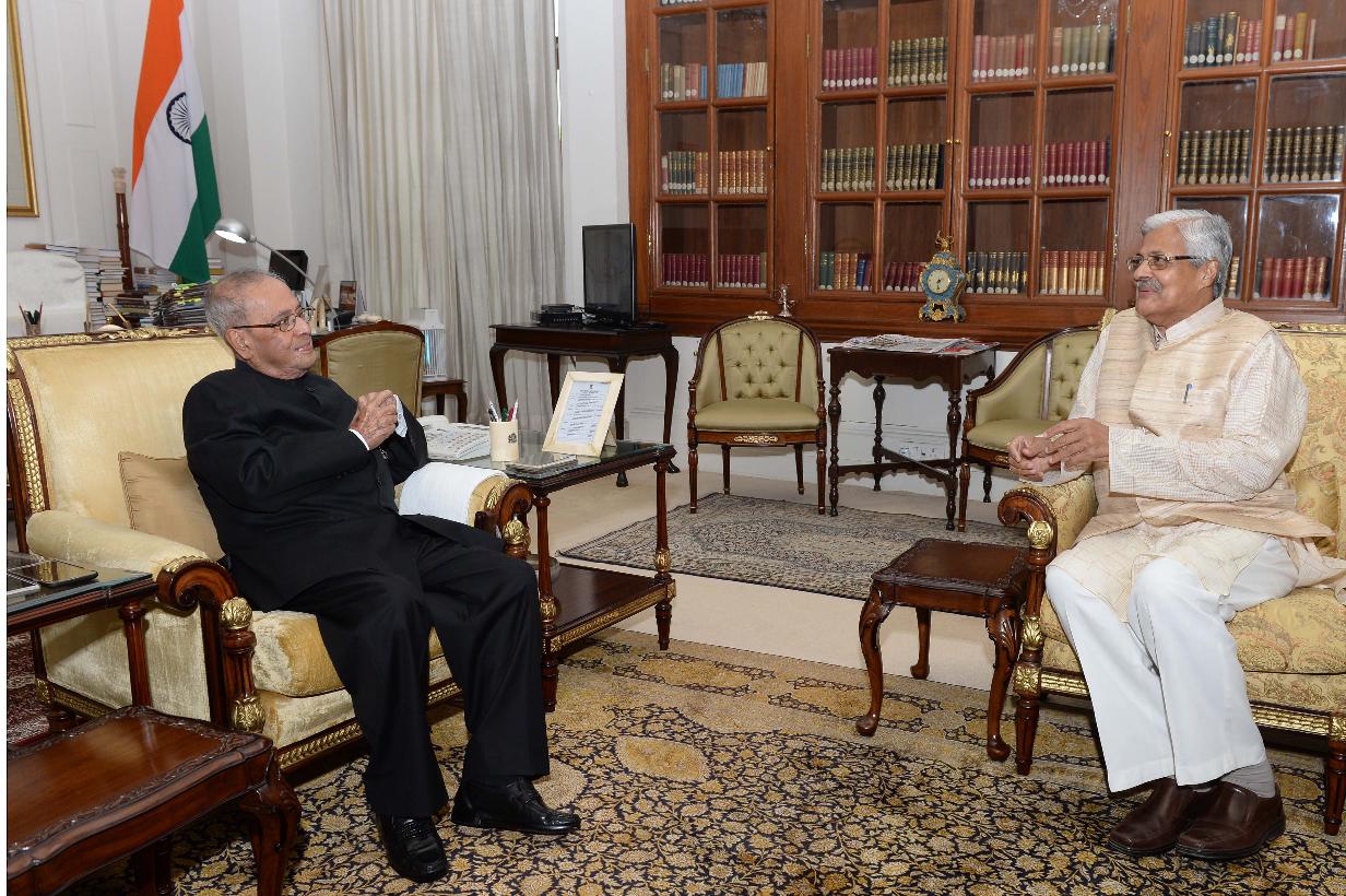 | Caption: | The President of India, Shri Pranab Mukherjee meeting with Shri Pratapbhanu Sharma, Ex-MP & Member, AICC, at Rashtrapati Bhavan on May 01, 2017. |