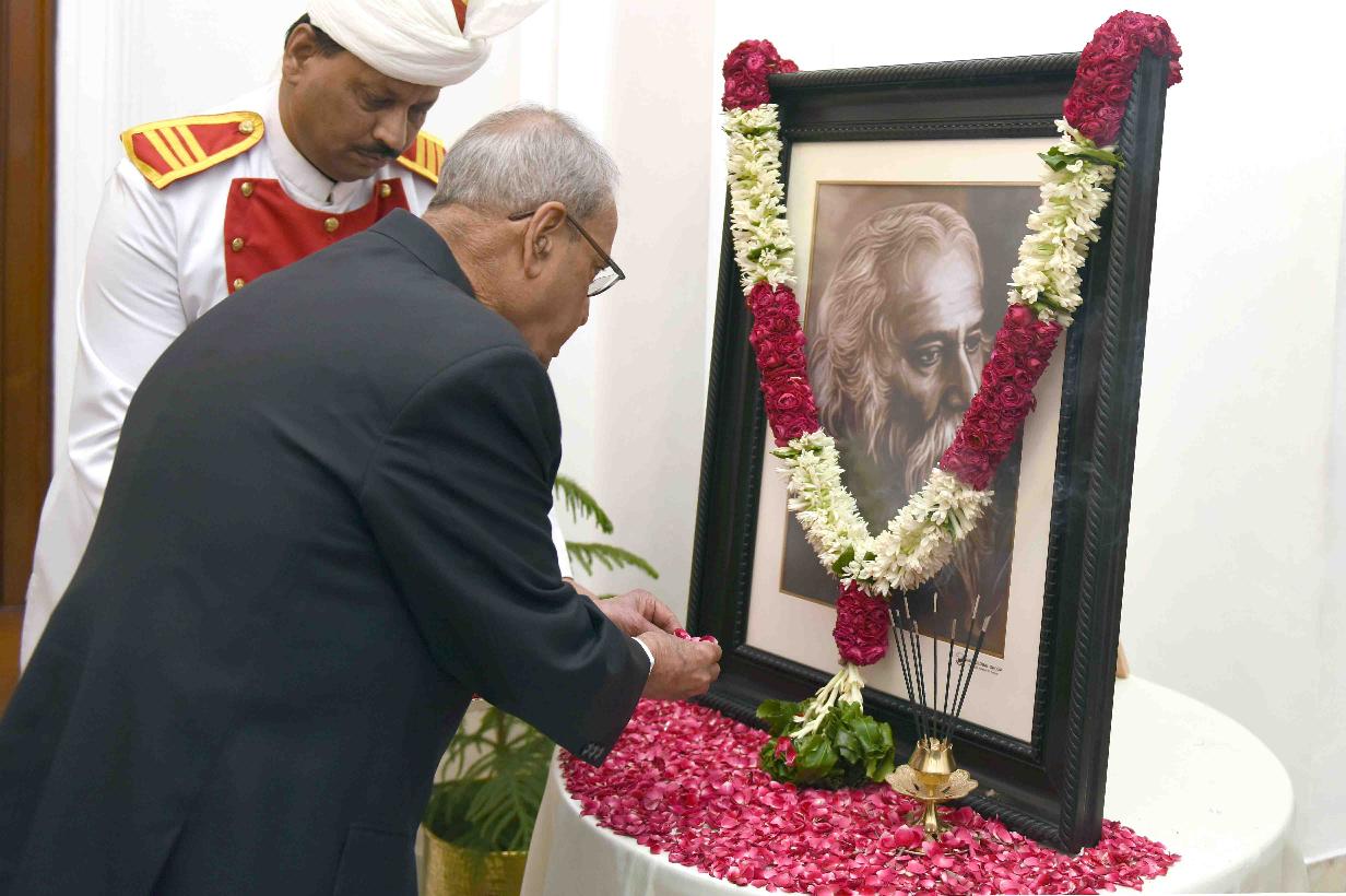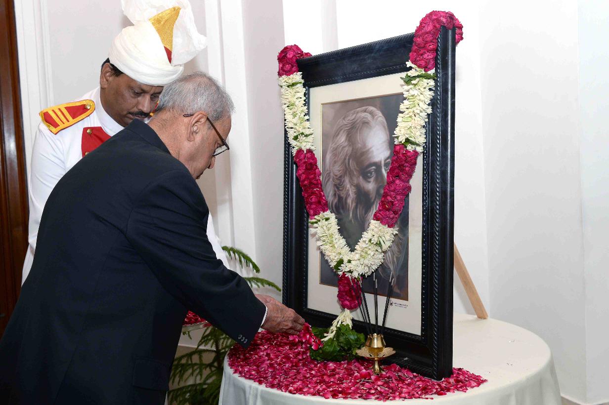 | Caption: | The President of India, Shri Pranab Mukherjee paying floral tributes at the portrait of Guru Rabindranath Tagore, on the occasion of his Birthday, at Rashtrapati Bhavan on May 09, 2017. |