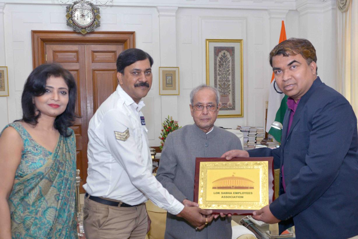 | Caption: | The President of India, Shri Pranab Mukherjee meeting with Shri Sanjeev Kumar, President with other office bearers of the Lok Sabha Employees Association, at Rashtrapati Bhavan on May 08, 2017. |