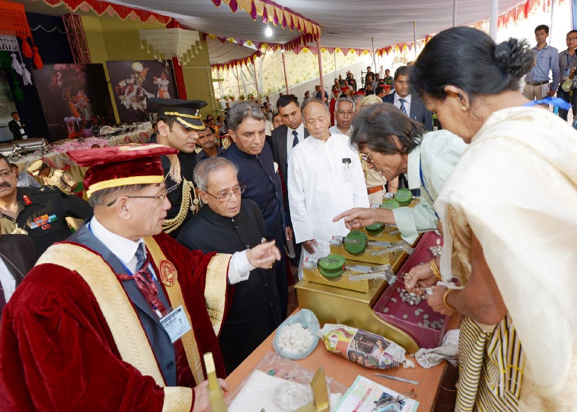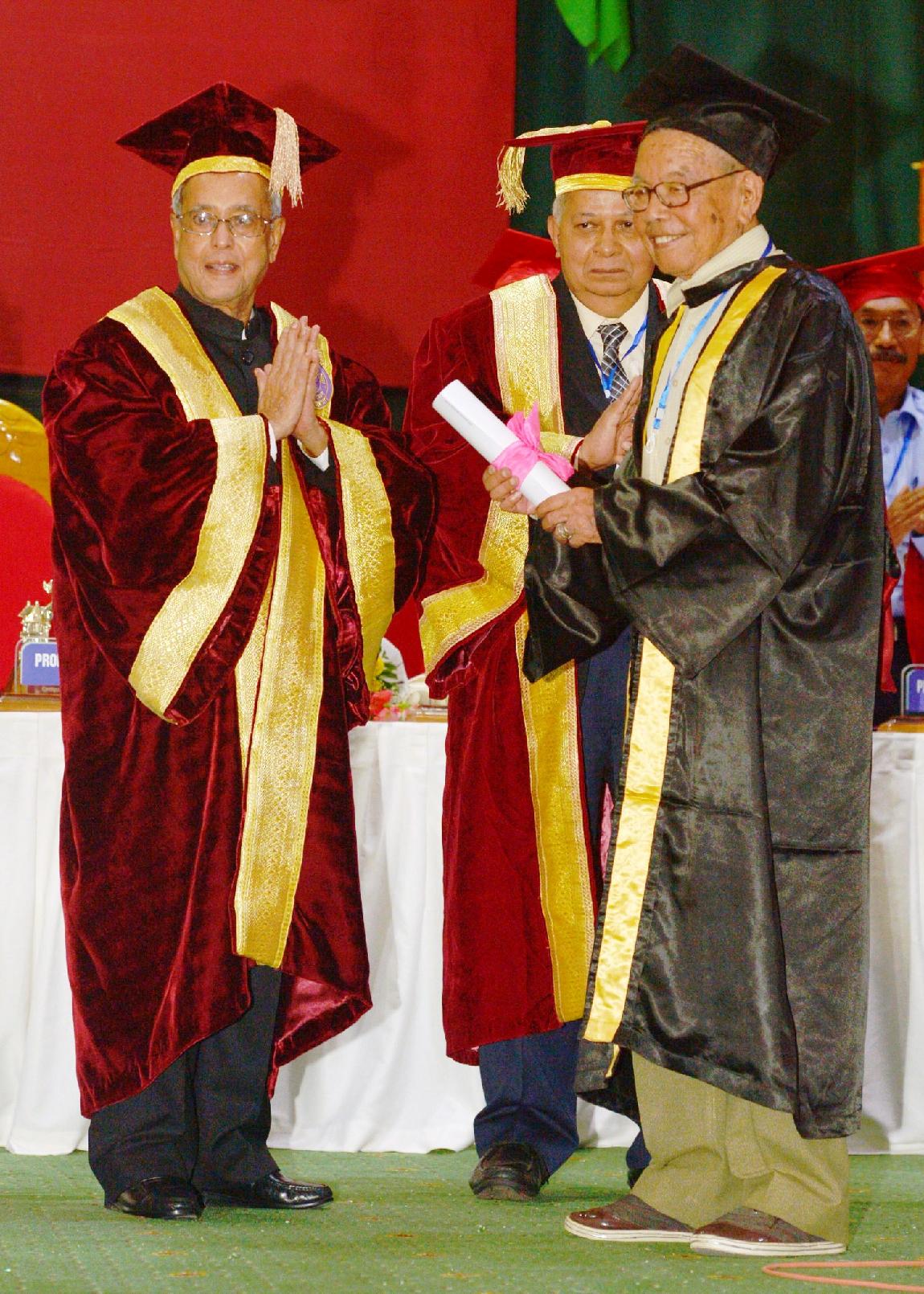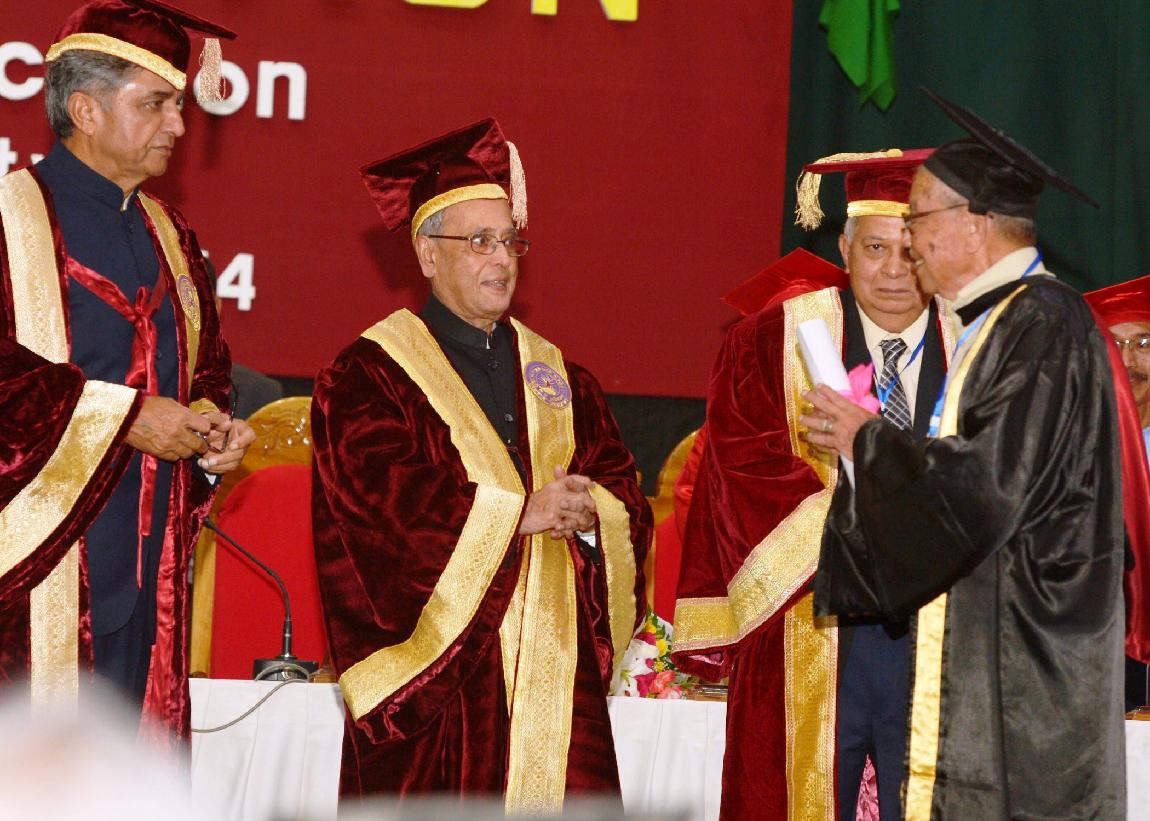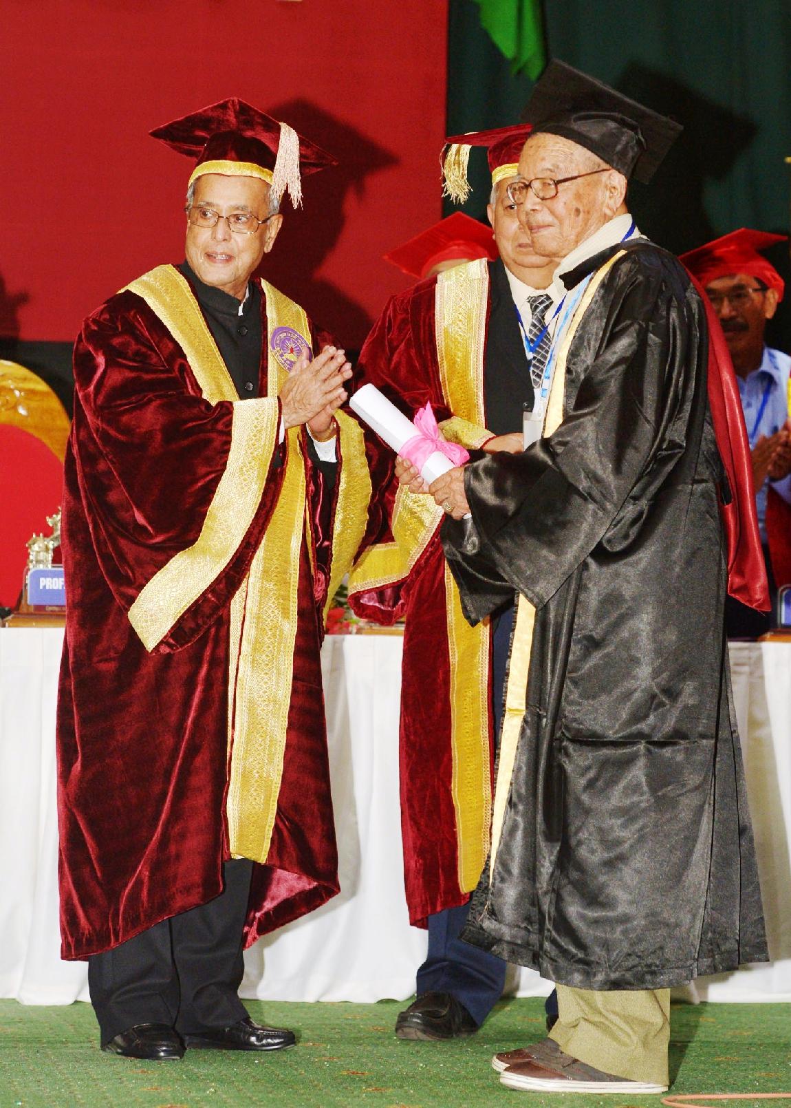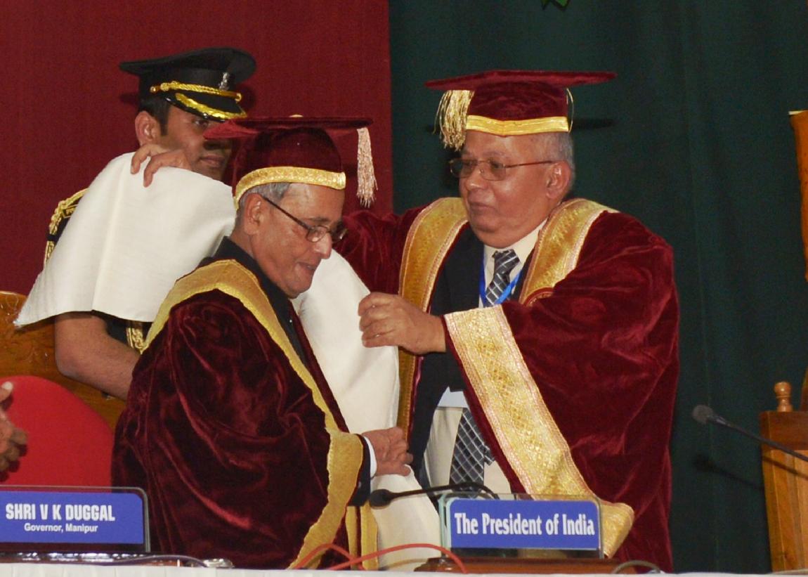| Caption: | The President of India, Shri Pranab Mukherjee conferring Honorary Degrees to Shri Rishang Keishing and Shri L Birendrakumar Singh during 14th Convocation of Manipur University at Canchipur in Imphal, Manipur, The President also went around an Innovation Exhibition after inauguration of it on April 29, 2014 |
