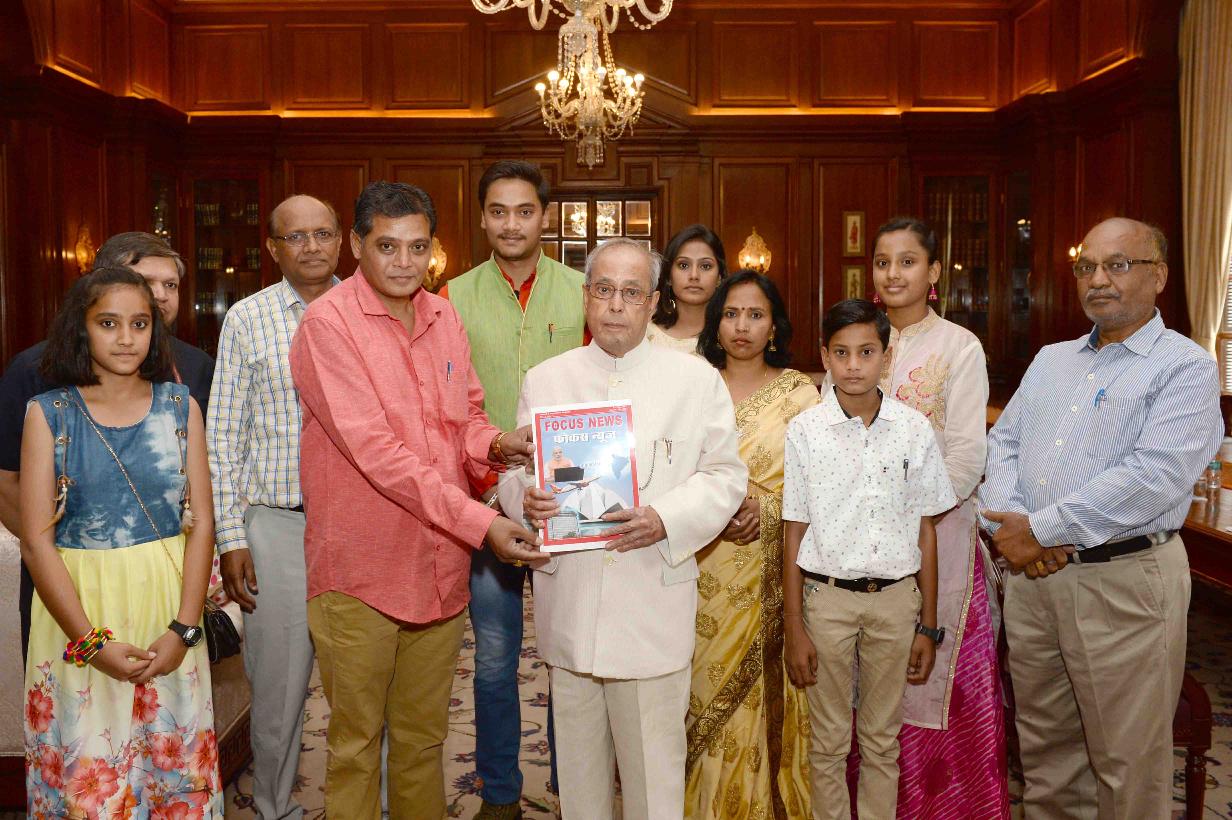 | Caption: | The President of India, Shri Pranab Mukherjee receiving a copy of the magazine ''Focus News'' from Shri Chandra Shekhar Aggarwal, Editor & CEO, Focus News & Managing Director, Eye TV Network Pvt. Ltd with others, at Rashtrapati Bhavan on May 03, 2017. |