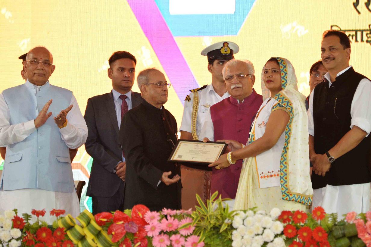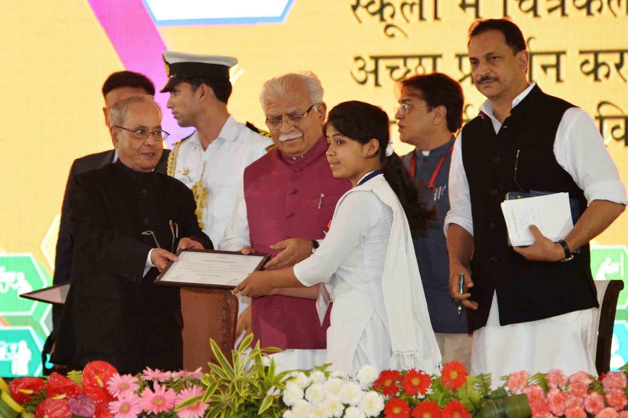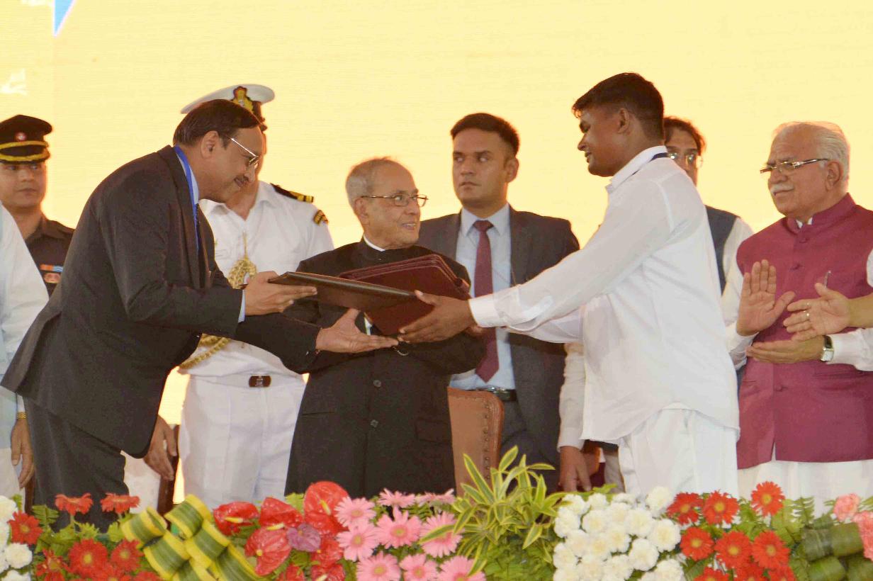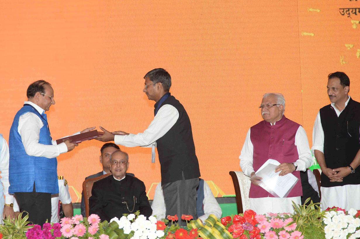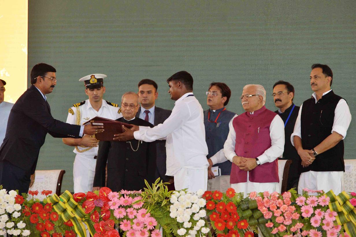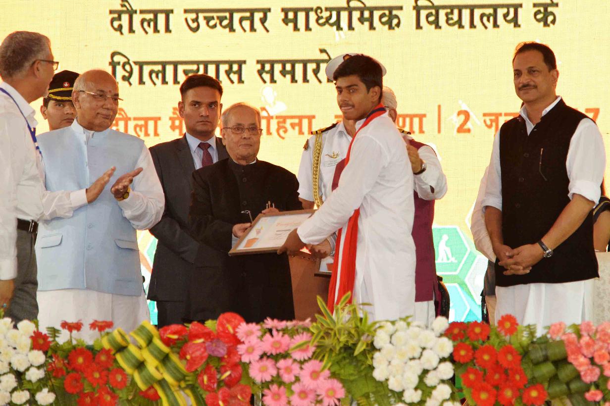 | Caption: | The President of India, Shri Pranab Mukherjee witnessing the exchange of MoUs and distributing the certificates to students/trainees under various initiatives, at the Foundation Stone laying of The Driver's Training Institute & Secondary School under the Smart Gram Initiative, at village Dhaula, Gurugram, in Haryana on June 02, 2017. |