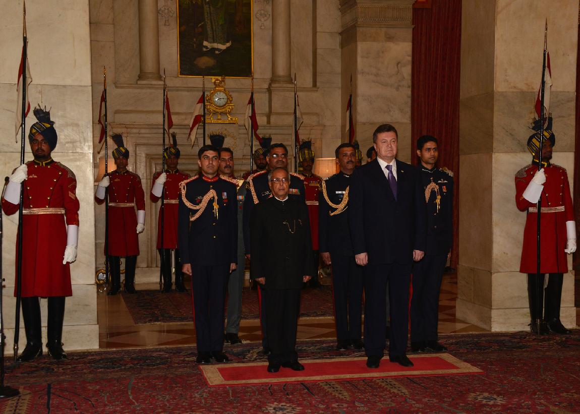 | Caption: | The President of India, Shri Pranab Mukherjee receives HE Mr Viktor Yanukovych, President of Ukraine during his Ceremonial Reception at Rashtrapati Bhavan on december 12, 2012 The Prime Minister, Dr Manmohan Singh is also seen |