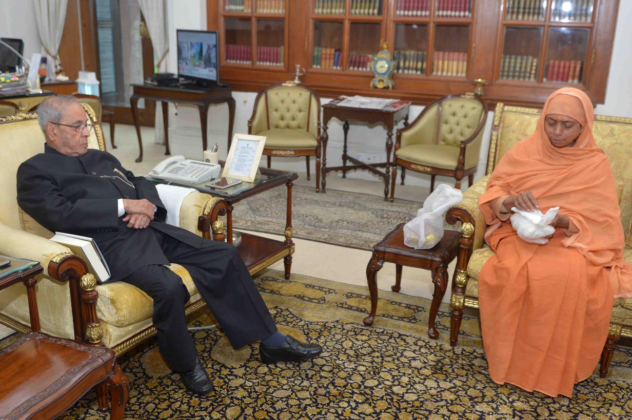 | Caption: | The President of India, Shri Pranab Mukherjee meeting with Ms. Dipanwita Mukhopadhyay (Prabrajika Panchhi Prakashmayee) from Uttarkashi, at Rashtrapati Bhavan on June 28, 2017. |