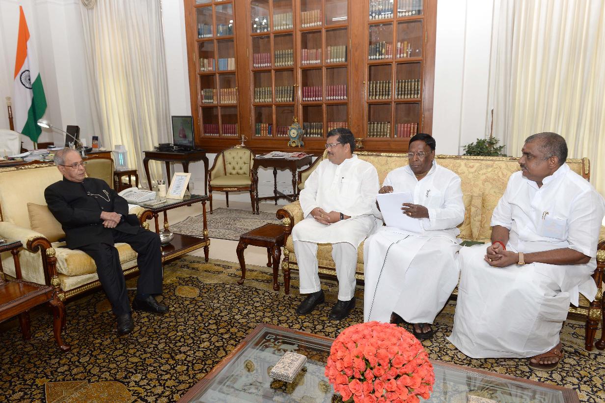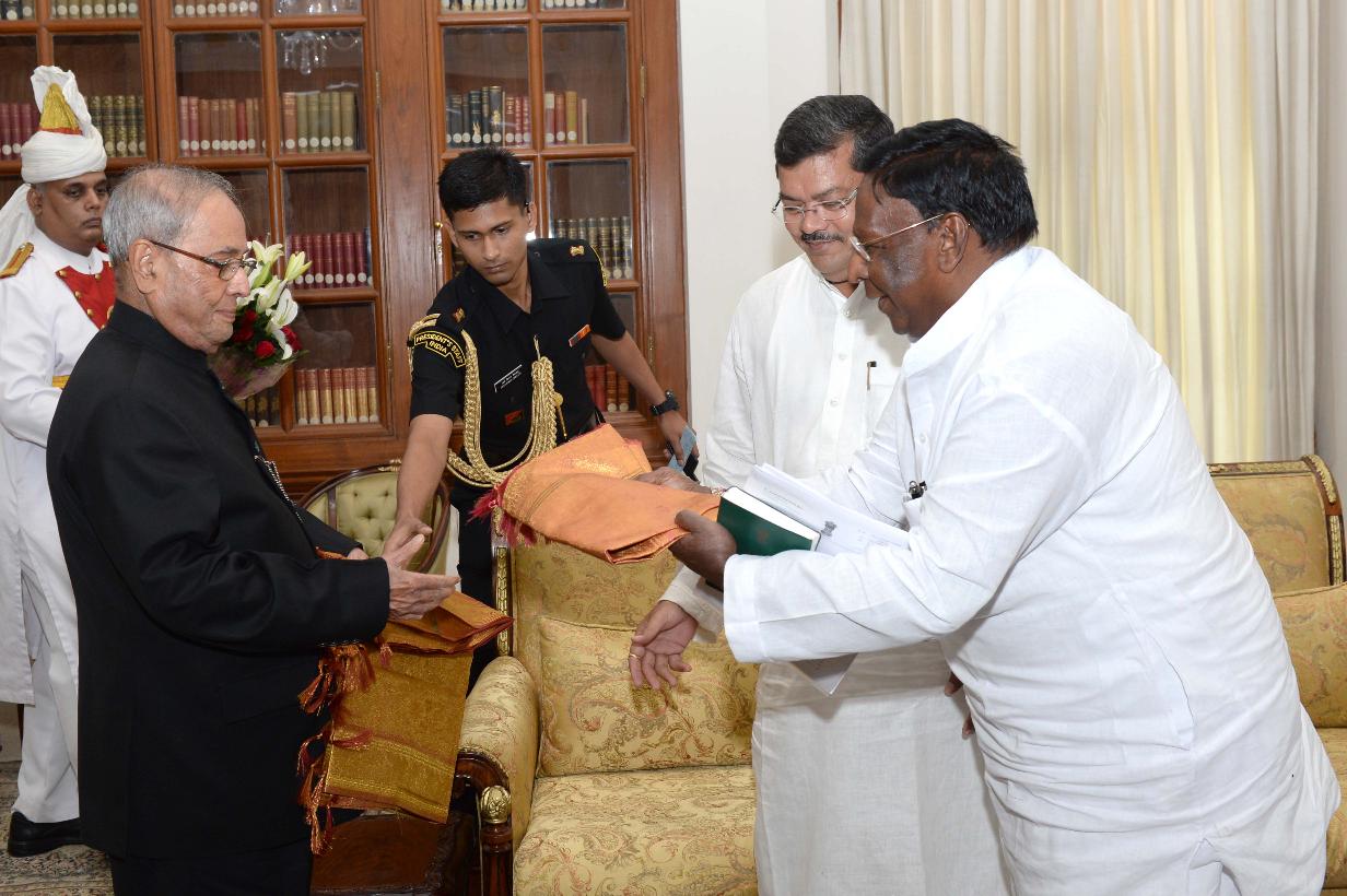 | Caption: | The President of India, Shri Pranab Mukherjee meeting with Shri V. Narayanasamy, Chief Minister of Puducherry alongwith Shri Namasivayam, PWD Minister, Puducherry and Shri Mukul Wasnik, former Union Minister, at Rashtrapati Bhavan on June 26, 2017. |