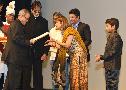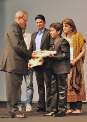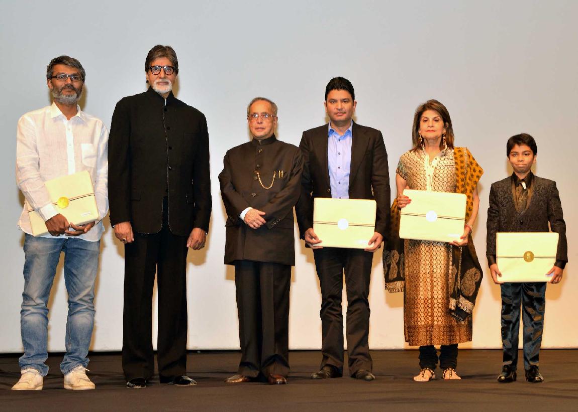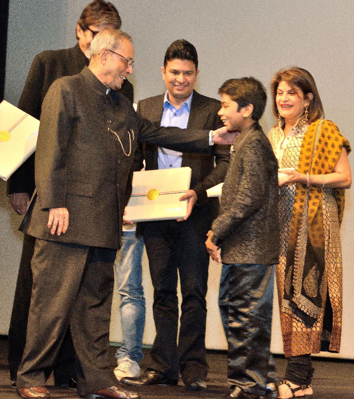 | Caption: | The President of India, Shri Pranab Mukherjee with Amitabh Bachchan and other Artists of "Bhootnath Returns", which was Screening as a Special Show at Rashtrapati Bhavan Auditorium in New Delhi on April 17, 2014 |
