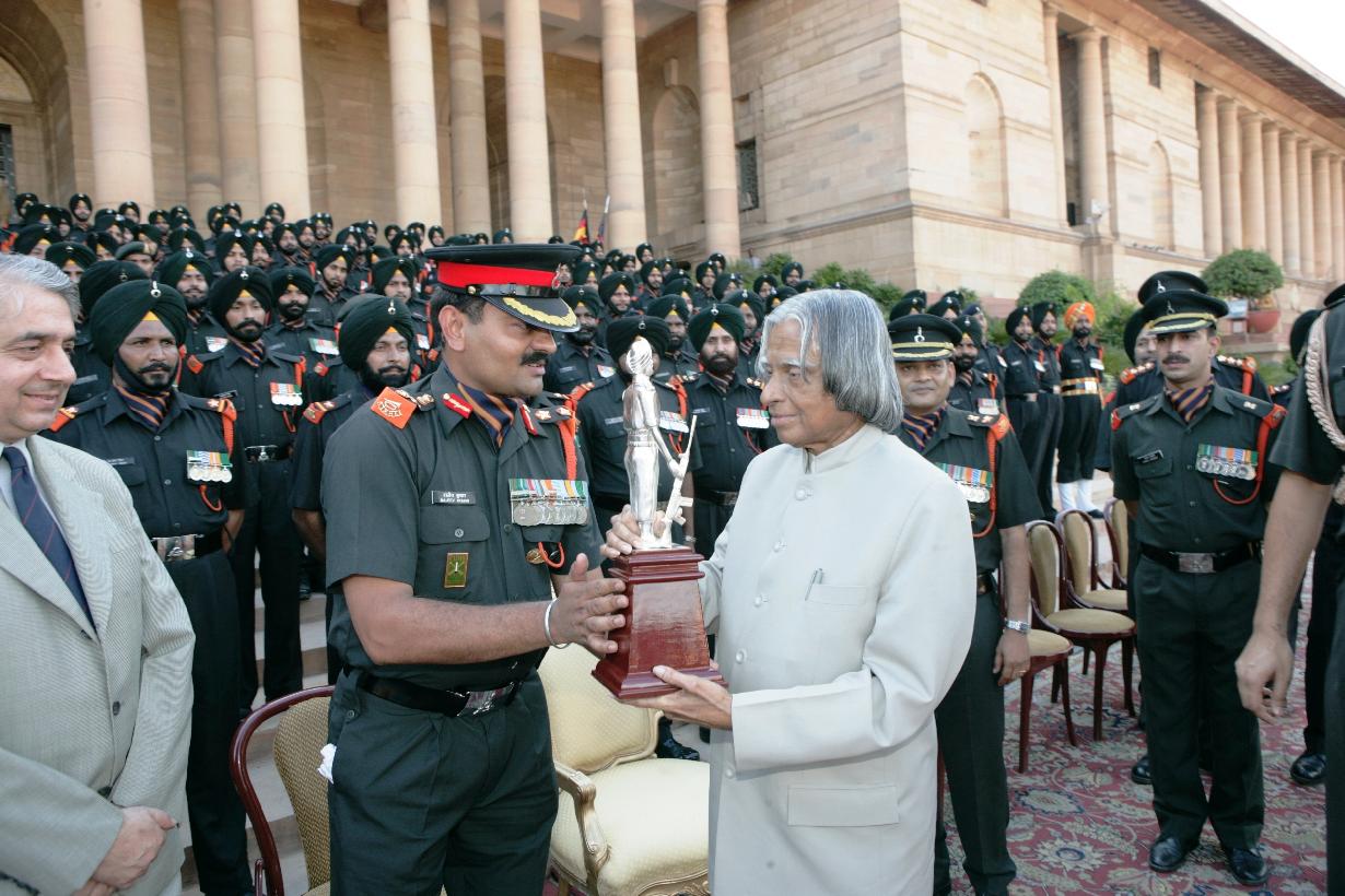 | Caption: | The President of India, Dr A P J Abdul Kalam posing for a Group photograph with the Officers, JCOs and Ors of 4SIKH LI at the Forecourt of Rashtrapati Bhavan in New Delhi on July 06, 2006 |