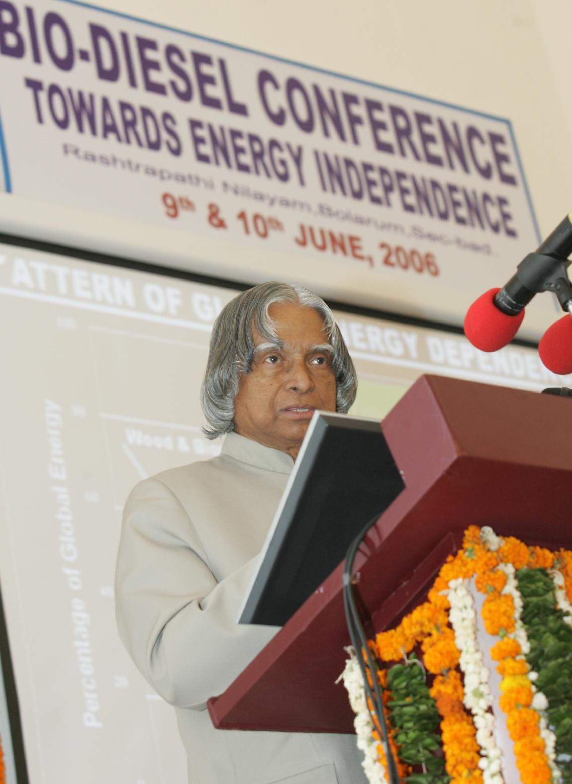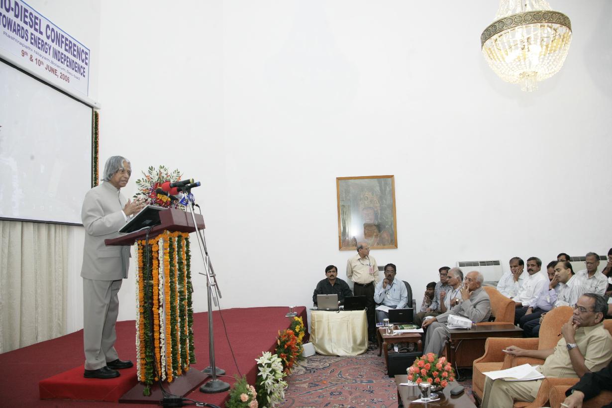 | Caption: | The President of India, Dr A P J Abdul Kalam addressing at the Workshop on Bio-Diesel towards Energy Independence at Rashtrapati Nilayam at Hyderabad in Andhra Pradesh on June 09, 2006 |