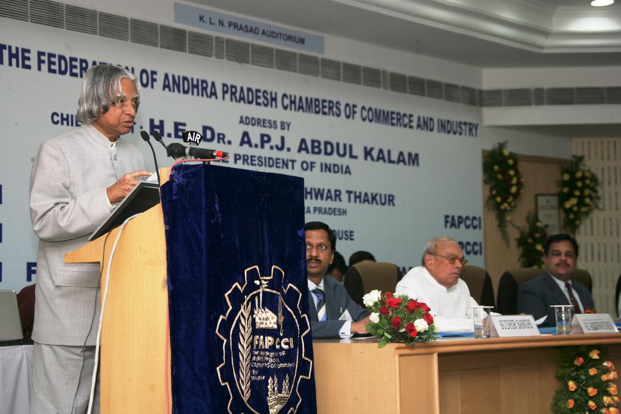 | Caption: | The President of India, Dr A P J Abdul Kalam addressing the Federation of Andhra Pradesh Chambers of Commerce and Industry (FAPCCI) at Hyderabad in Andhra Pradesh on June 10, 2006 |
