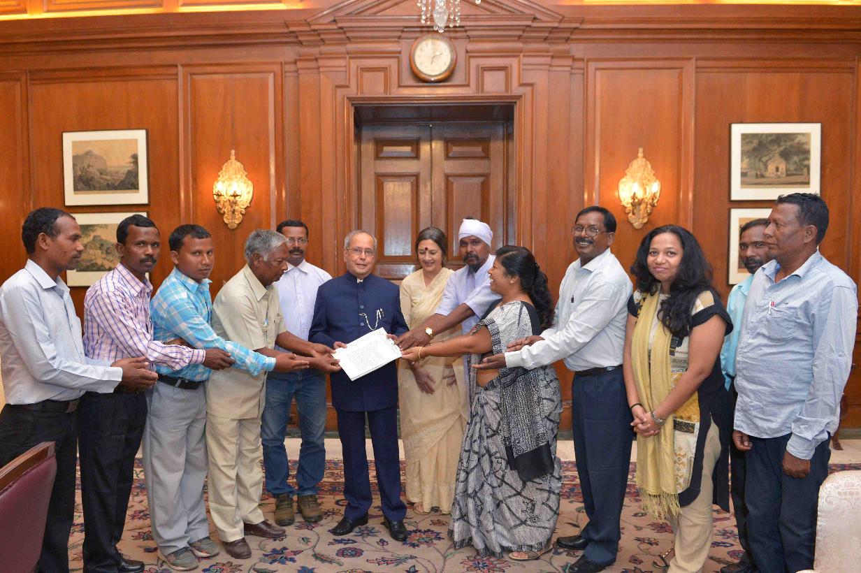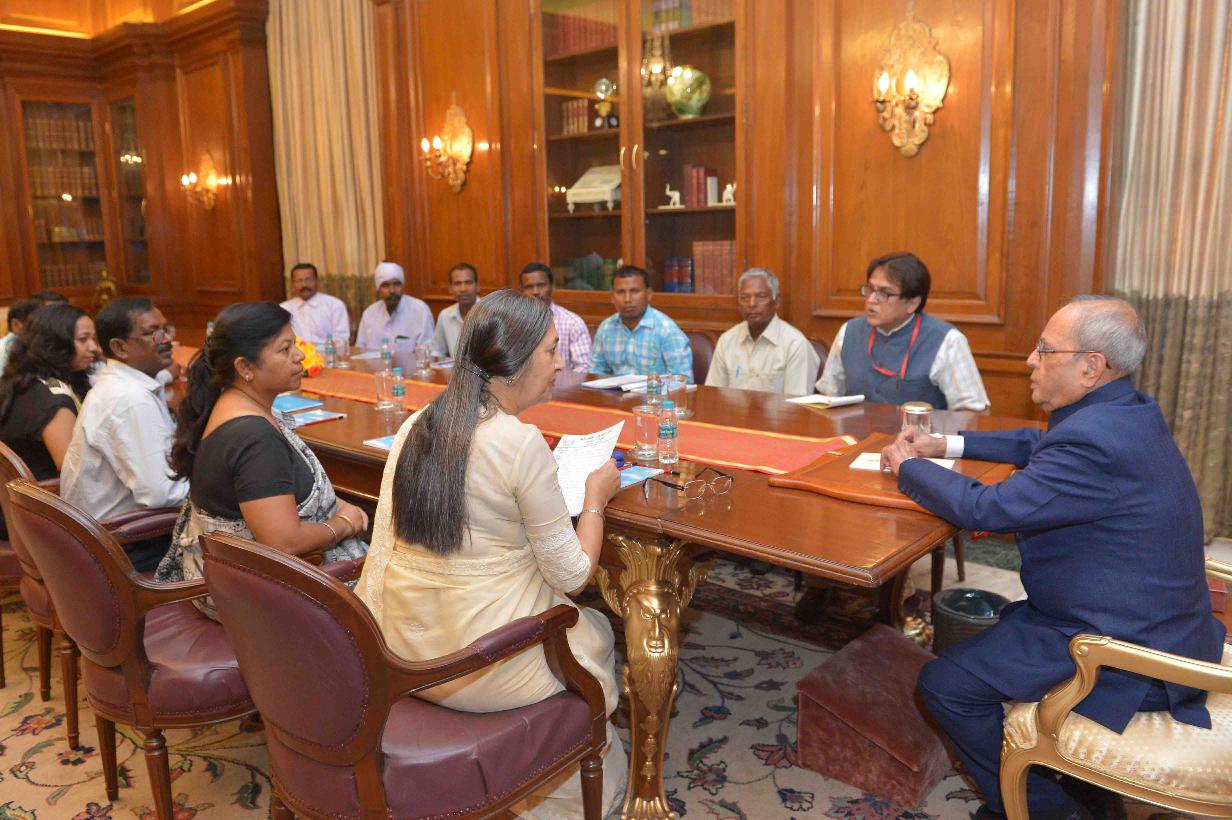 | Caption: | The President of India, Shri Pranab Mukherjee meeting with Smt. Brinda Karat, Polit Bureau Member, CPI (M) alongwith a delegation of Manki Mundas (traditional tribal chiefs) from Jharkhand, at Rashtrapati Bhavan on June 15, 2017. |