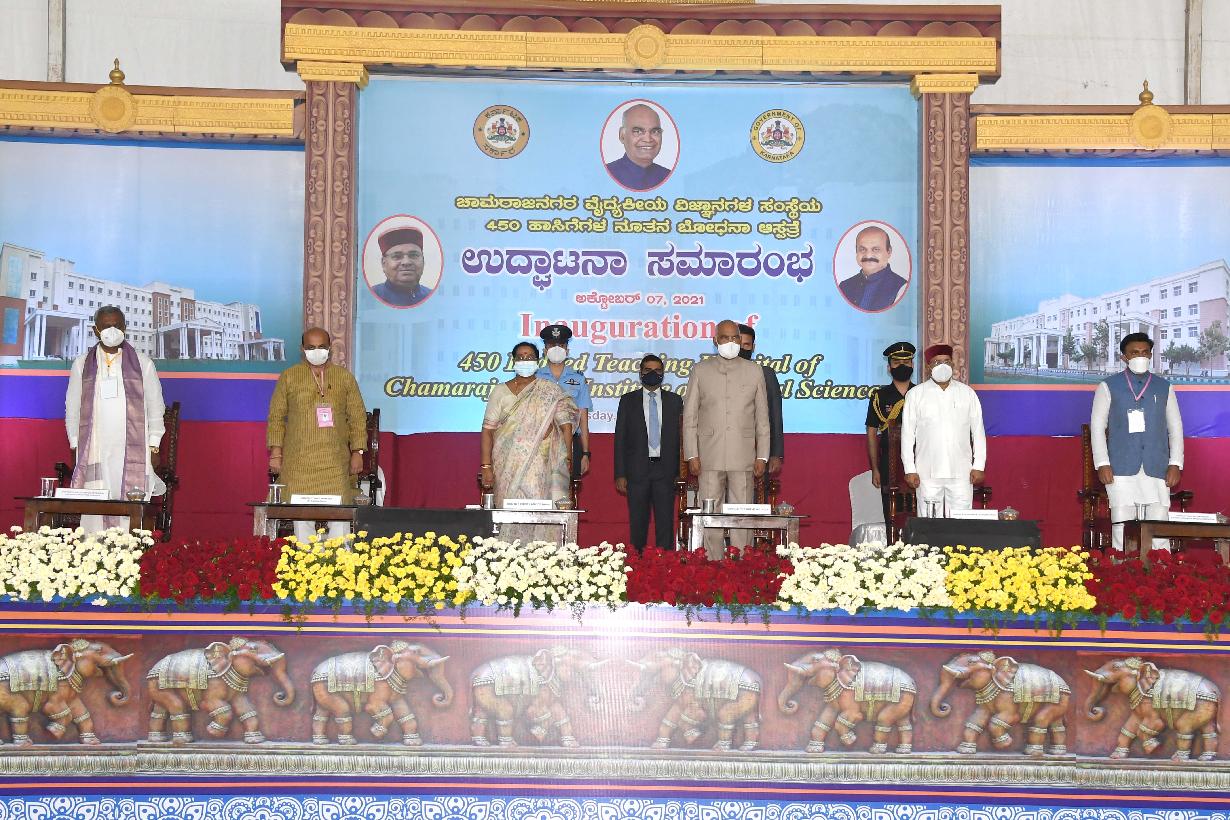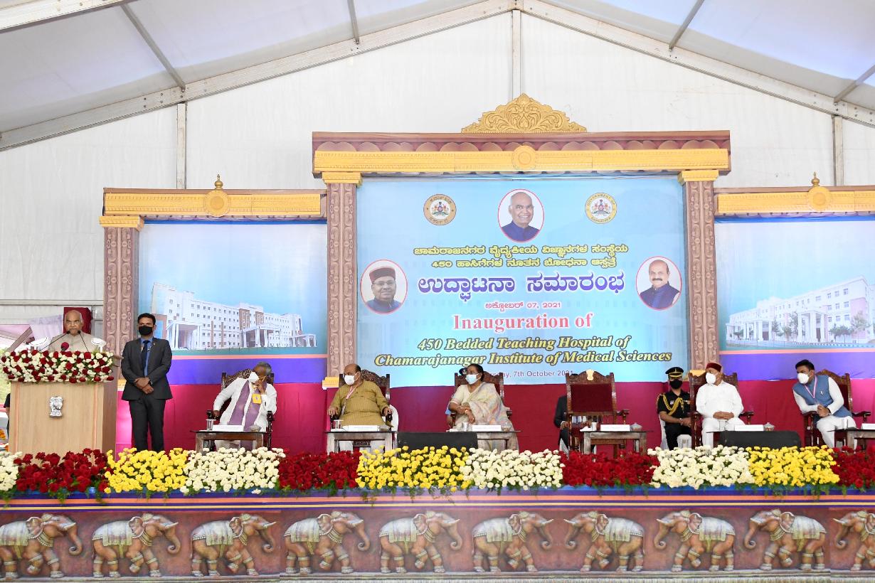 | Caption: | The President of India, Shri Ram Nath Kovind inaugurating the newly built Teaching Hospital of the Chamarajanagar Institute of Medical Sciences, at Chamarajanagar, in Karnataka on October 07, 2021. |