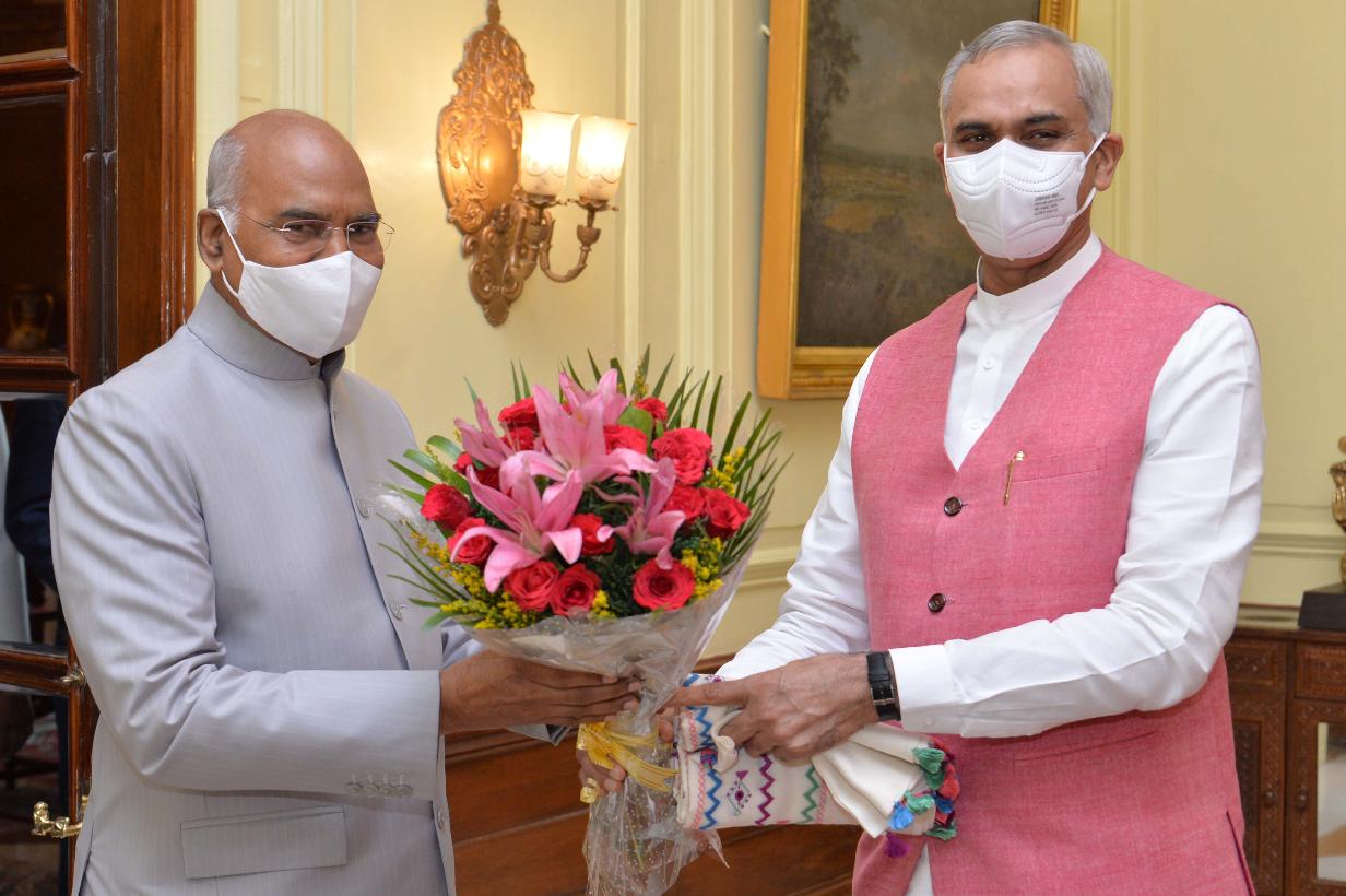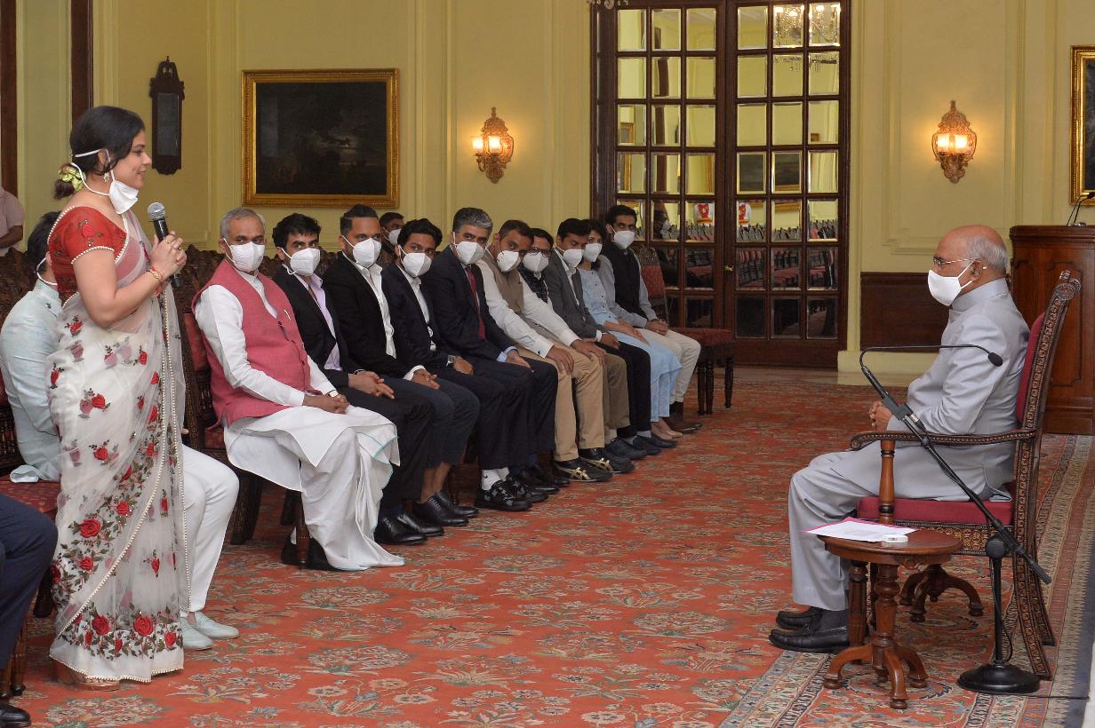 | Caption: | The Governor of Gujarat, Shri Acharya Devvrat along with a youth delegation calling on the President of India, Shri Ram Nath Kovind, at Rashtrapati Bhavan on October 11, 2021. |