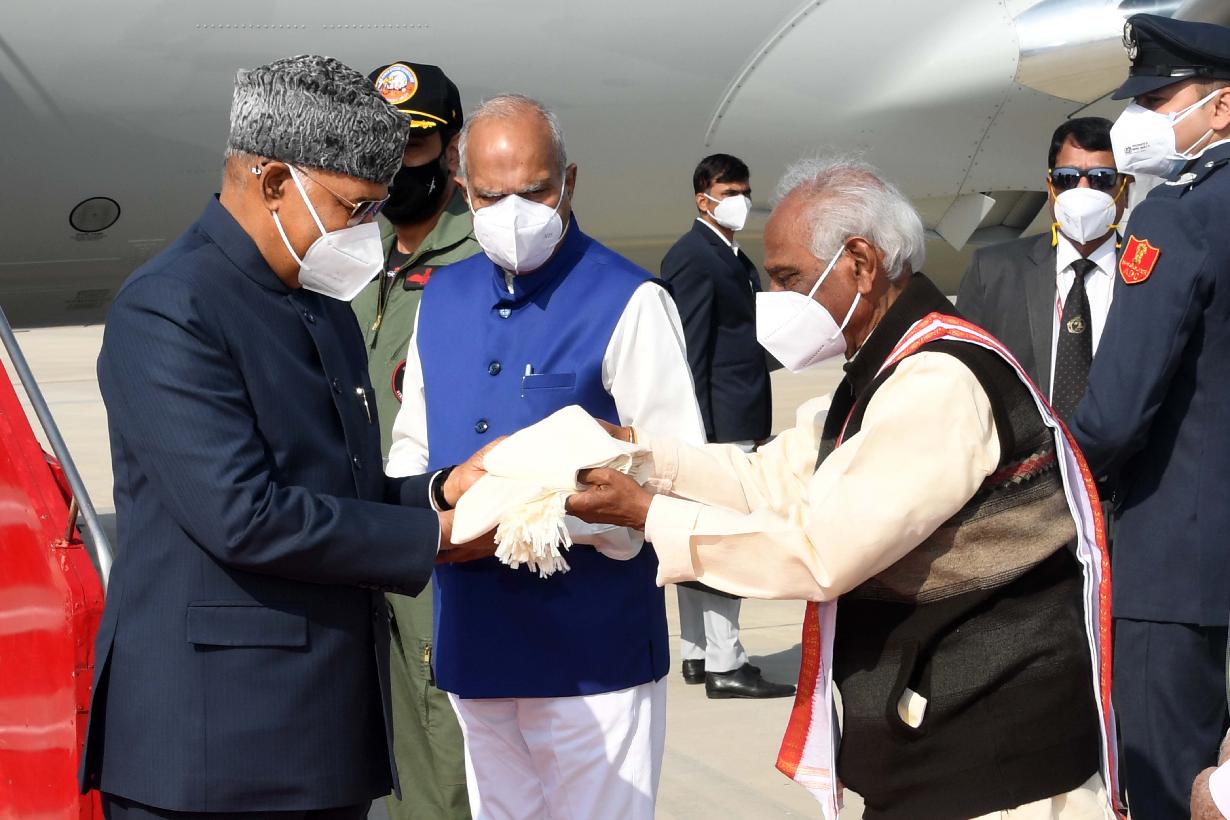 | Caption: | The President of India, Shri Ram Nath Kovind being received by the Governor of Punjab, Shri Banwarilal Purohit, the Governor of Haryana, Shri Bandaru Dattatreya and the Chief Minister of Haryana, Shri Manohar Lal Khattar on his arrival, at Chandigarh on November 16, 2021. |