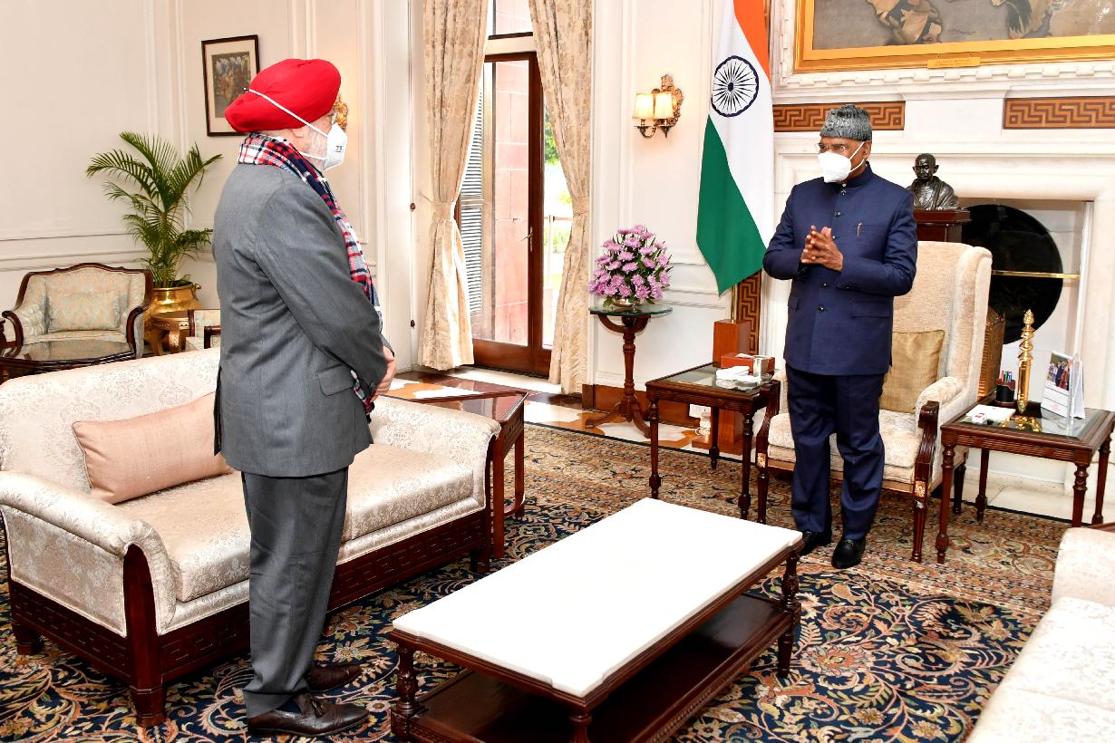 | Caption: | The Minister of Housing and Urban Affairs & Minister of Petroleum and Natural Gas, Shri Hardeep Singh Puri calling on the President of India, Shri Ram Nath Kovind, at Rashtrapati Bhavan on January 04, 2022. |