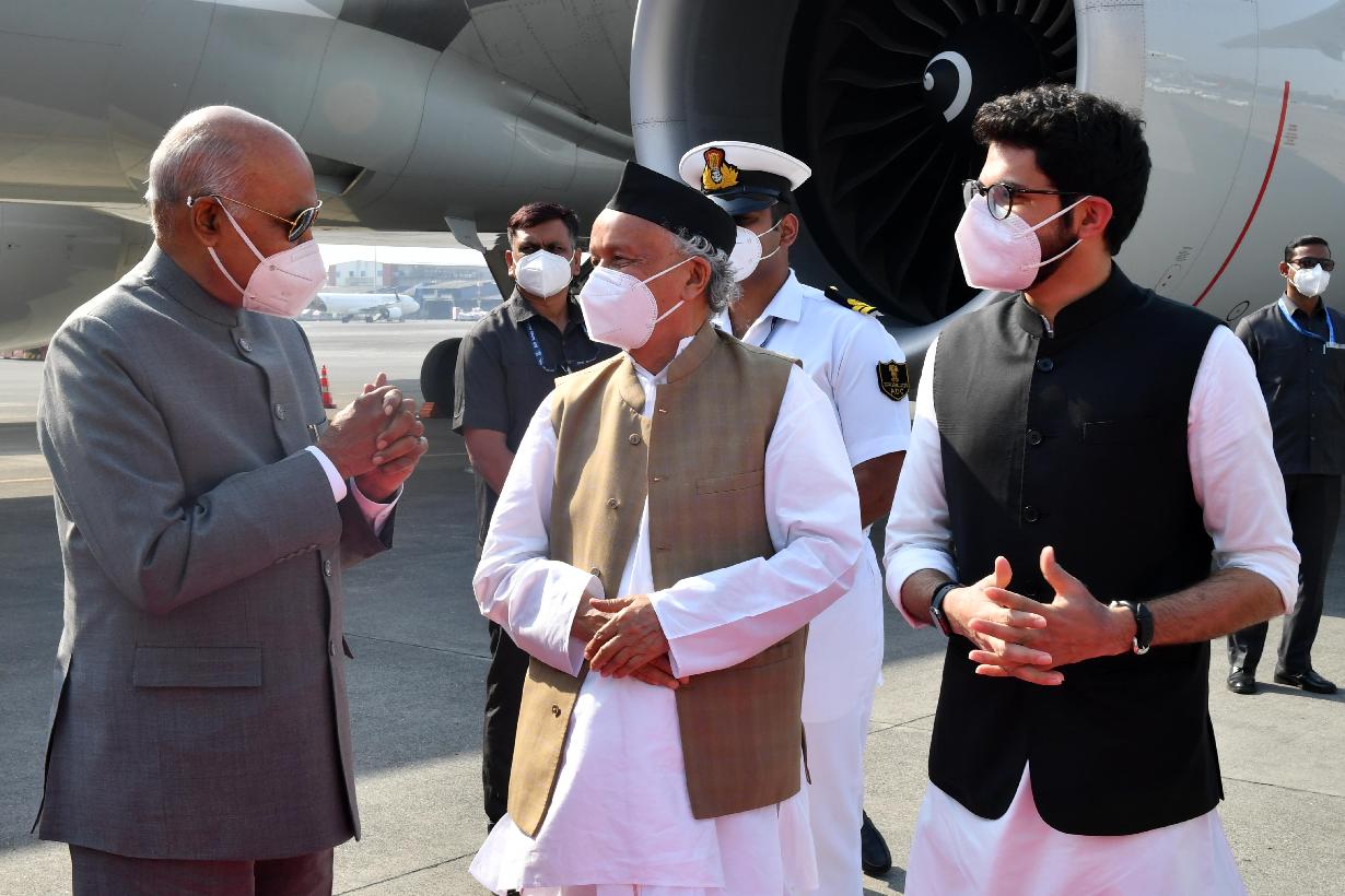 | Caption: | The President of India, Shri Ram Nath Kovind being received by the Governor of Maharashtra, Shri Bhagat Singh Koshyari and the Cabinet Minister, Govt. of Maharashtra, Shri Aaditya Thackeray, on his arrival, in Mumbai on February 10, 2022. |