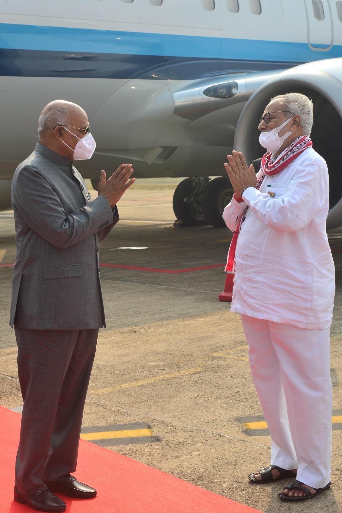 | Caption: | The President of India, Shri Ram Nath Kovind being received by the Governor of Odisha, Prof. Ganeshi Lal and the Chief Minister, Shri Naveen Patnaik, on his arrival, in Bhubaneswar on February 19, 2022. |