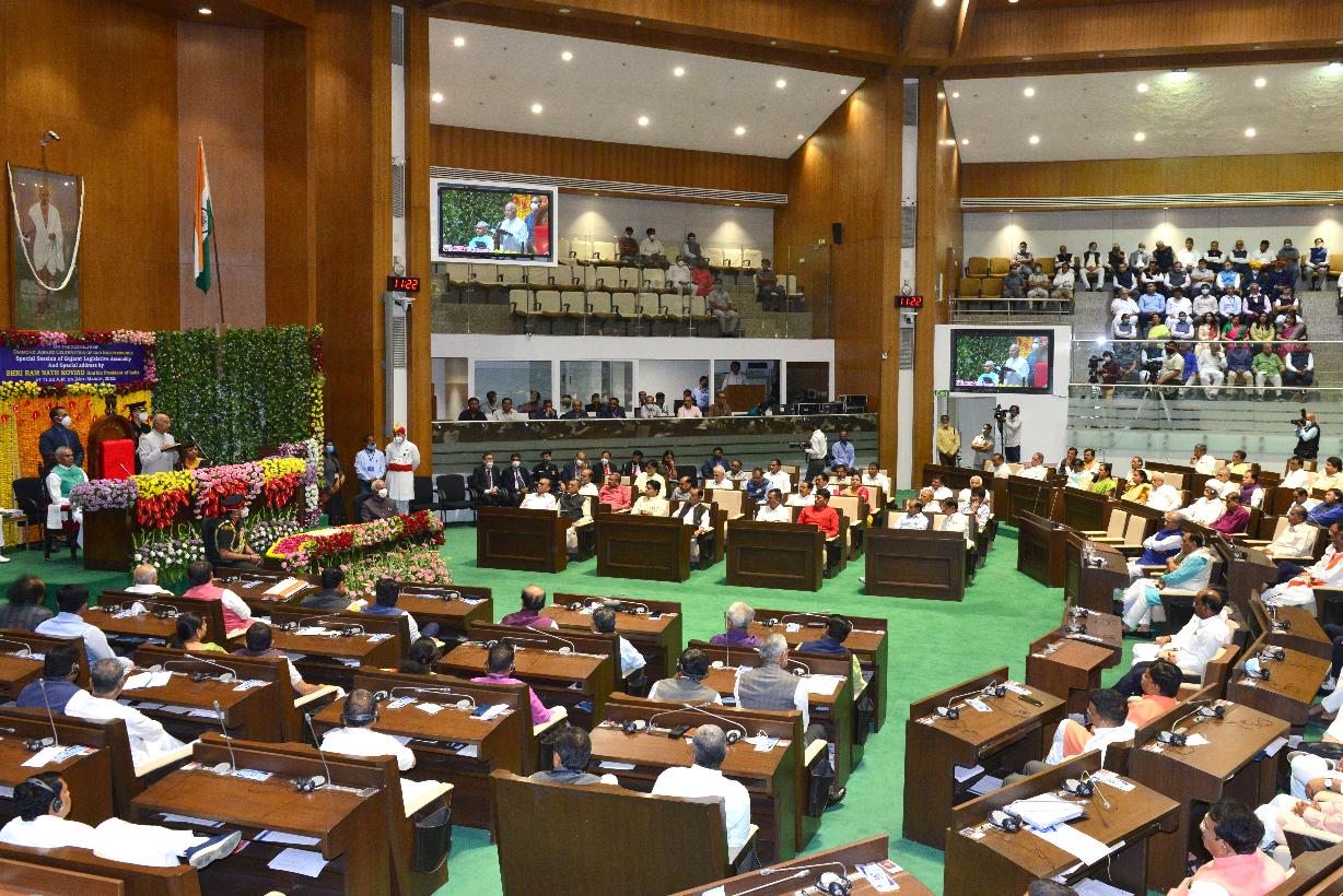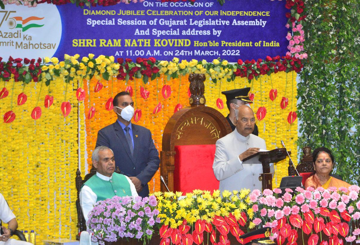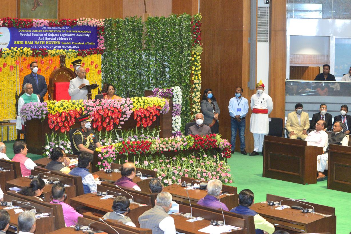 | Caption: | The President of India, Shri Ram Nath Kovind addressing the members of Gujarat Legislative Assembly, in Gandhinagar on March 24, 2022. |