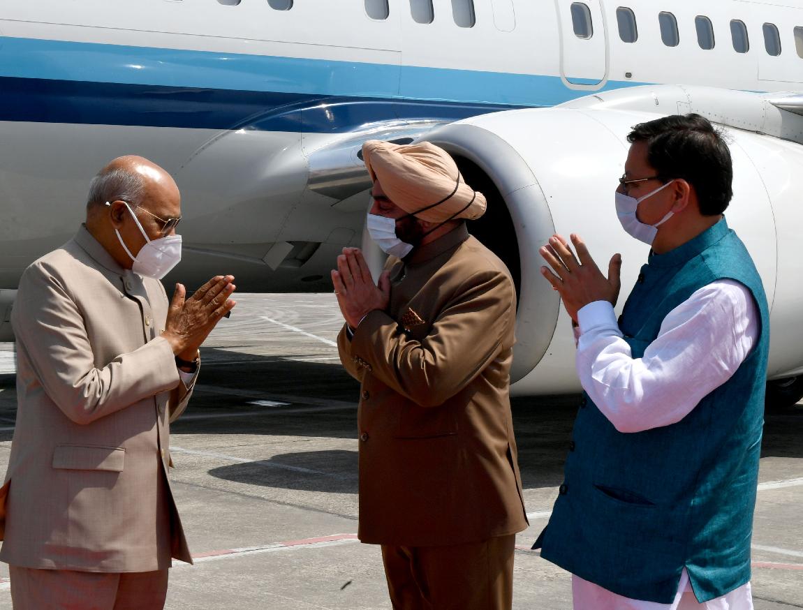 | Caption: | The President of India, Shri Ram Nath Kovind being received by the Governor of Uttarakhand, Lt. Gen. (Retd.) Gurmit Singh and the Chief Minister, Shri Pushkar Singh Dhami, on his arrival, at Dehradun on March 26, 2022. |