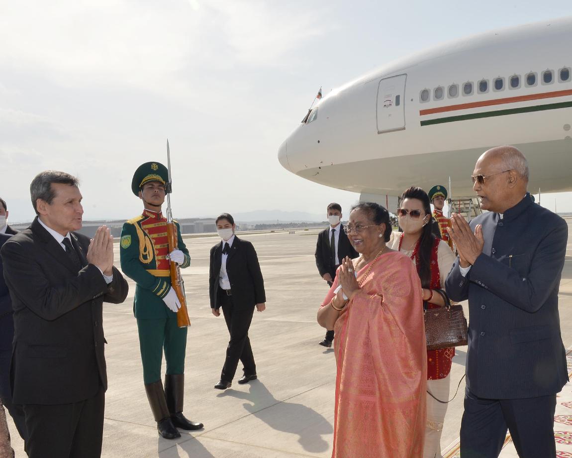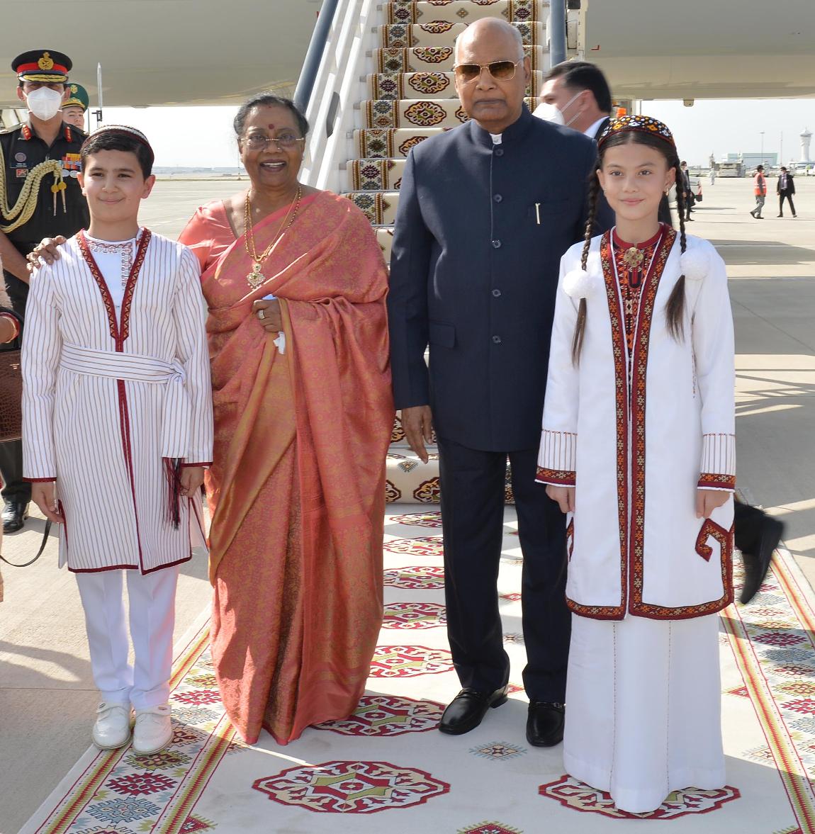 | Caption: | The President of India, Shri Ram Nath Kovind arrives at Asghabat International Airport, Turkmenistan on the first part of his two-nation visit on April 01, 2022. As per the Turkmen tradition, the President was offered bread and salt by children at the airport. |
